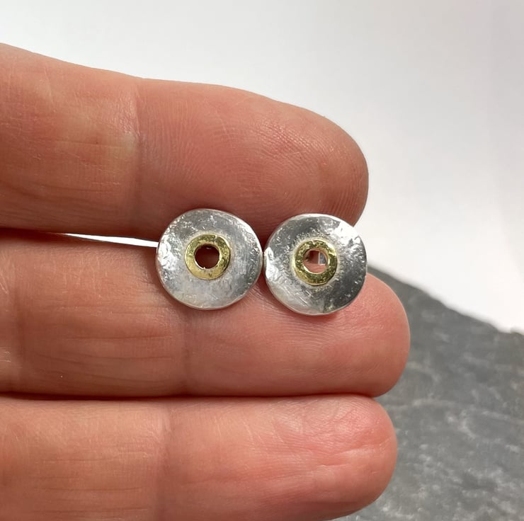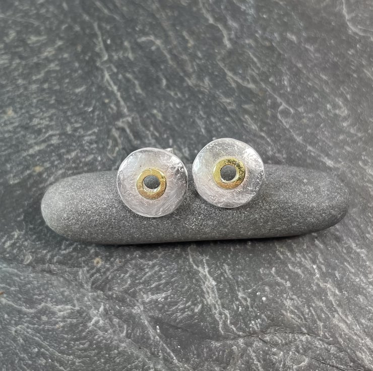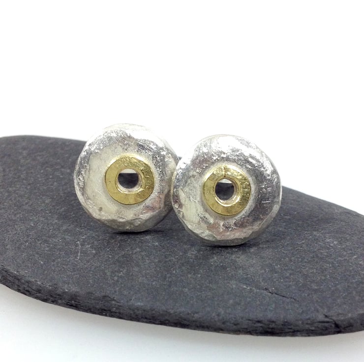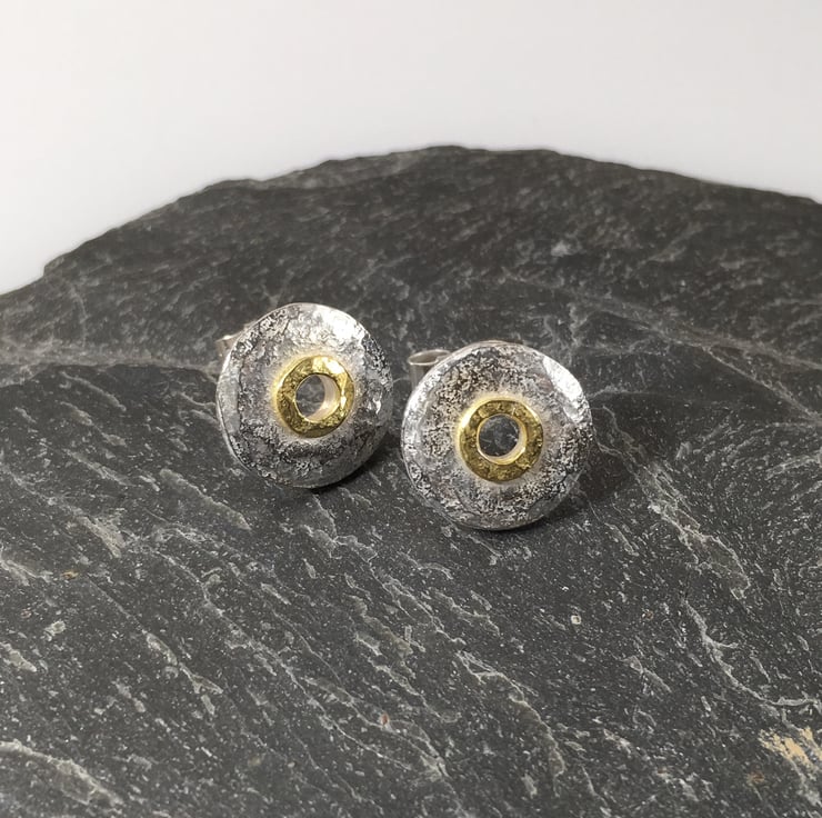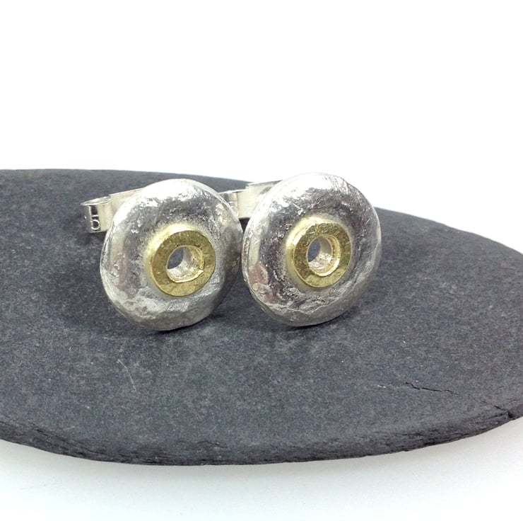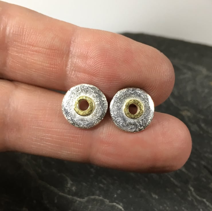 These small circular stud earrings have been cut and formed from thick sterling silver sheet, solid 18ct gold rings have been added and the whole beaten. The silver has been rubbed to a subtle satin finish, the gold is burnished bright.