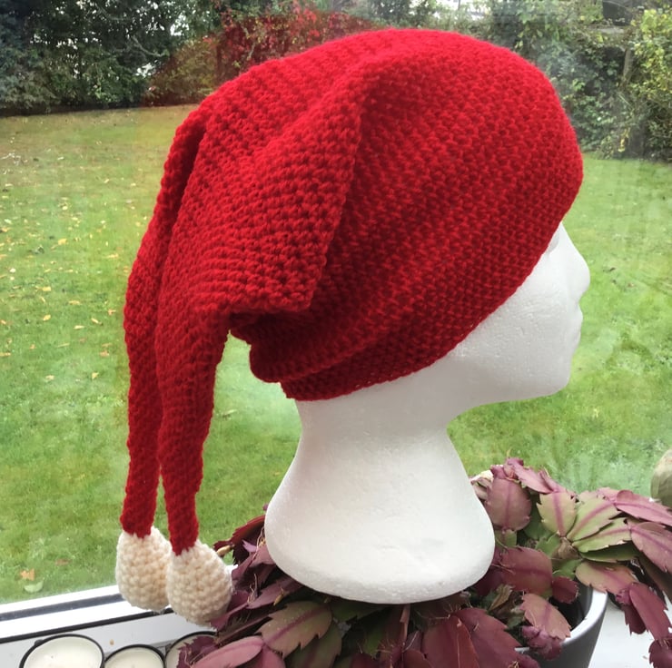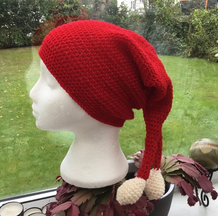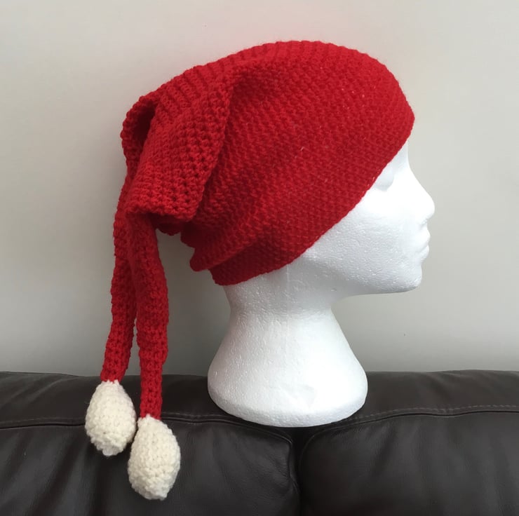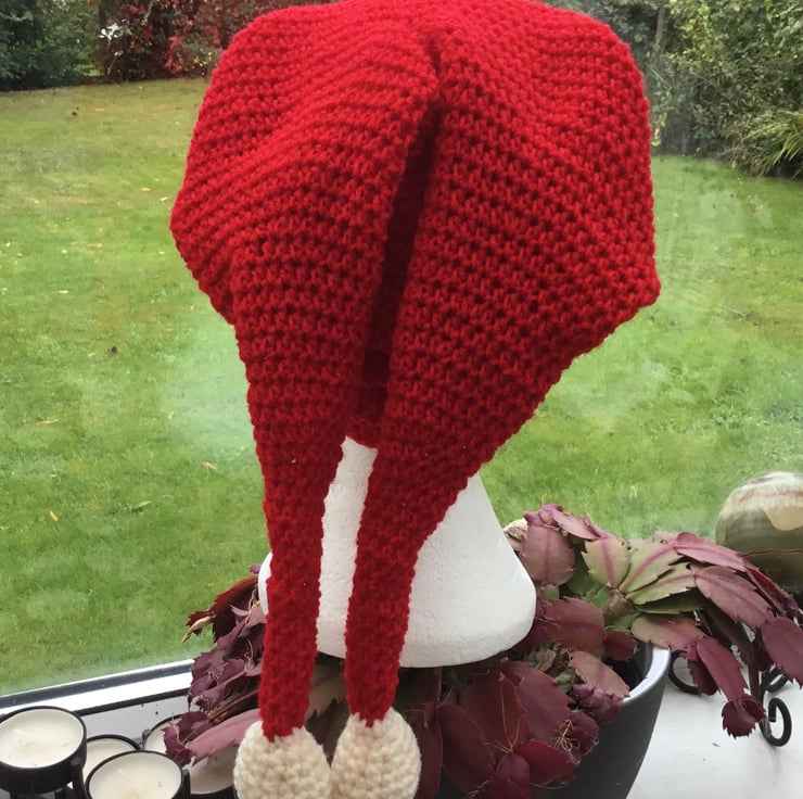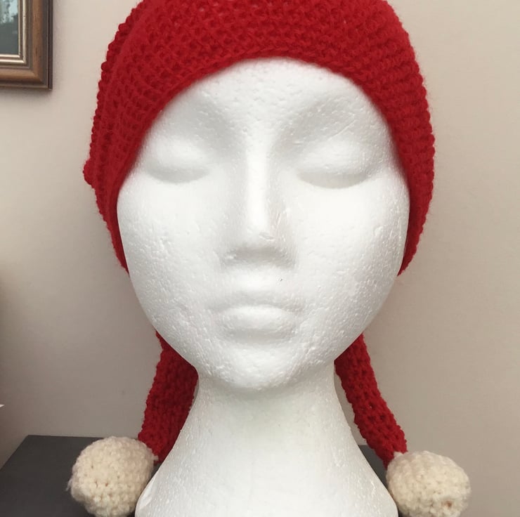 Fun Santa Crocheted Hat with a twist, as has two tails and with two crocheted cream bobbles, to give the full fun Santa effect!