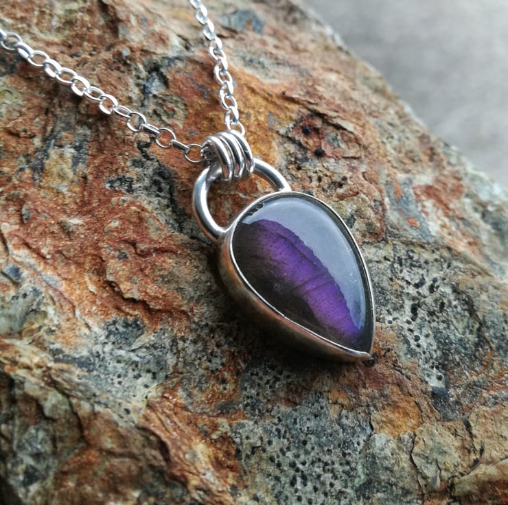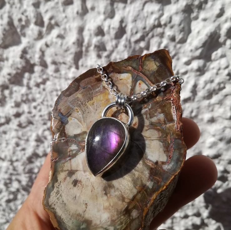 This beautiful necklace has a stunning purple labradorite. Made with Sterling Silver and Fine Silver on a 18" Sterling Silver chain.