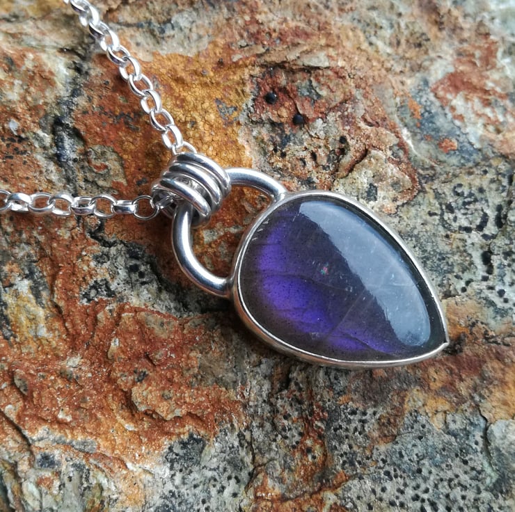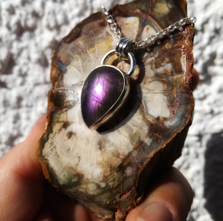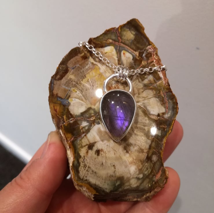 This beautiful necklace has a stunning purple labradorite. Made with Sterling Silver and Fine Silver on a 18" Sterling Silver chain.