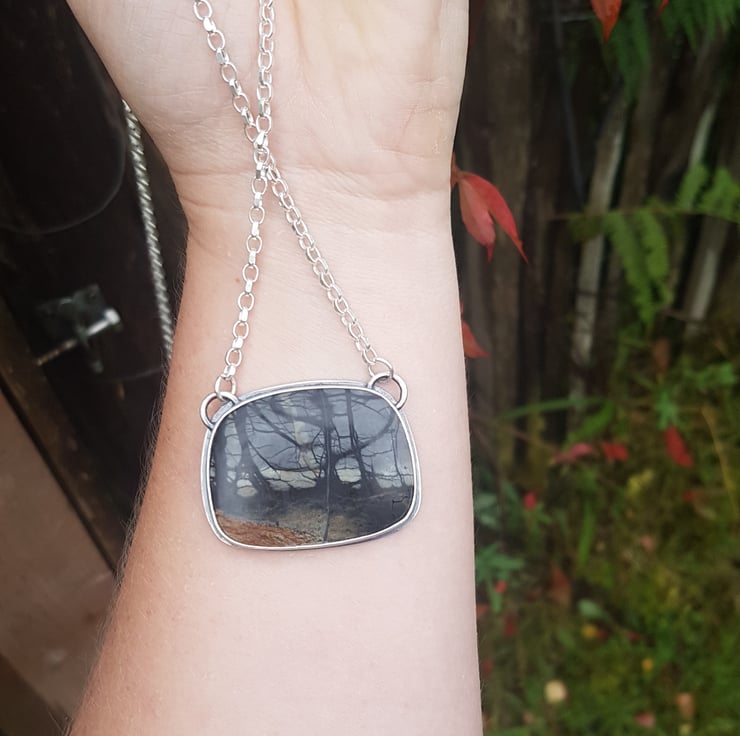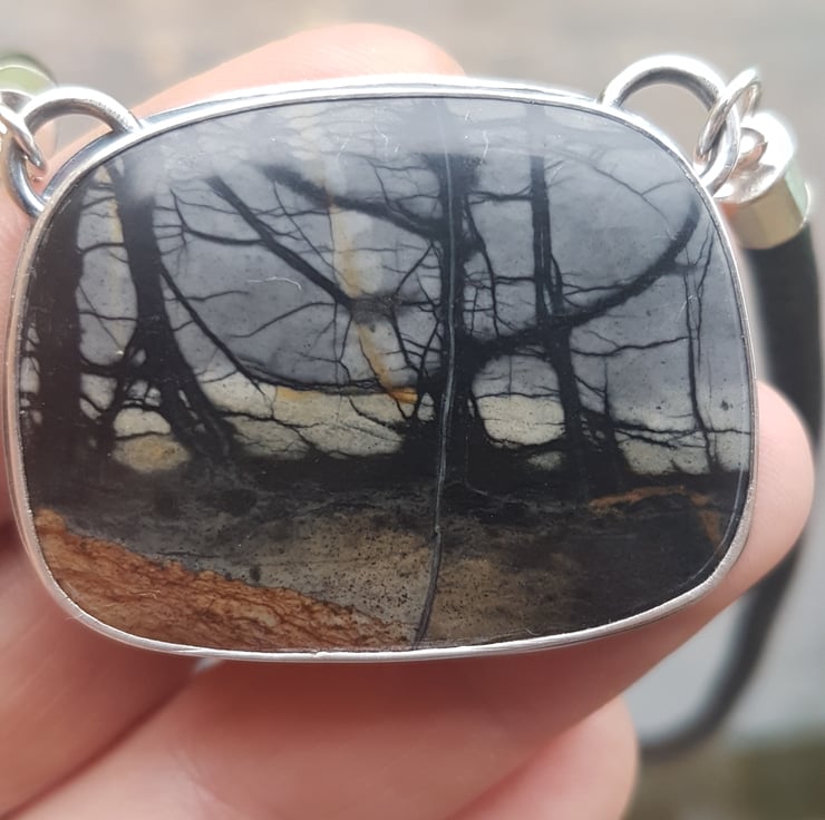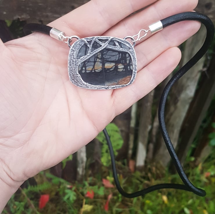 This one if a kind necklace is made from an incredible unique piece of jasper stone, its natural form has grown into what looks like a spooky woodland scenes both sides.