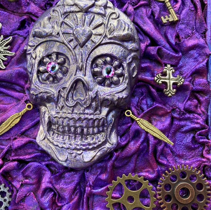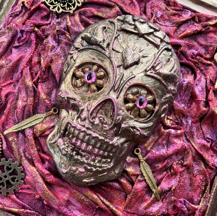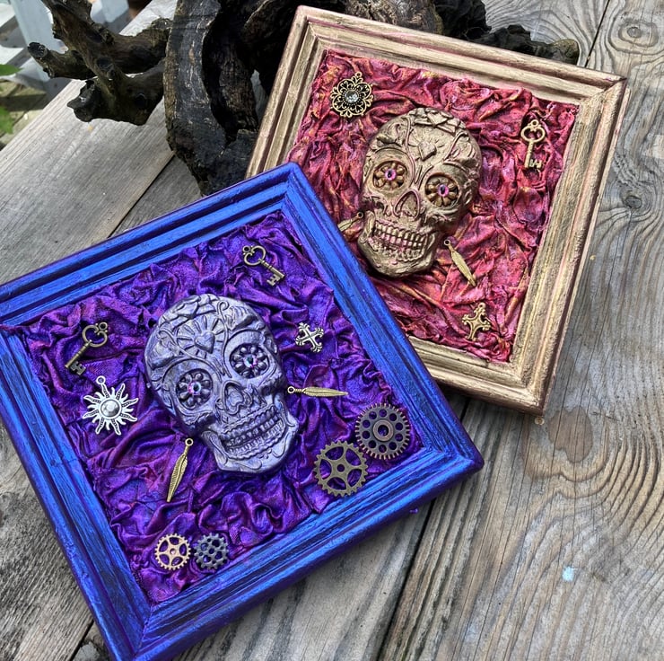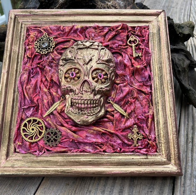 Delightfully Gothic square hanging, approx 18cm x 18cm. Each one is slightly different, but feature a painted clay skull on a Powertex fabric background, with steampunk embellishments. All very 'now'.