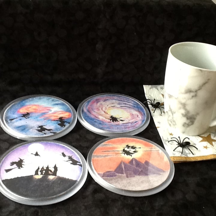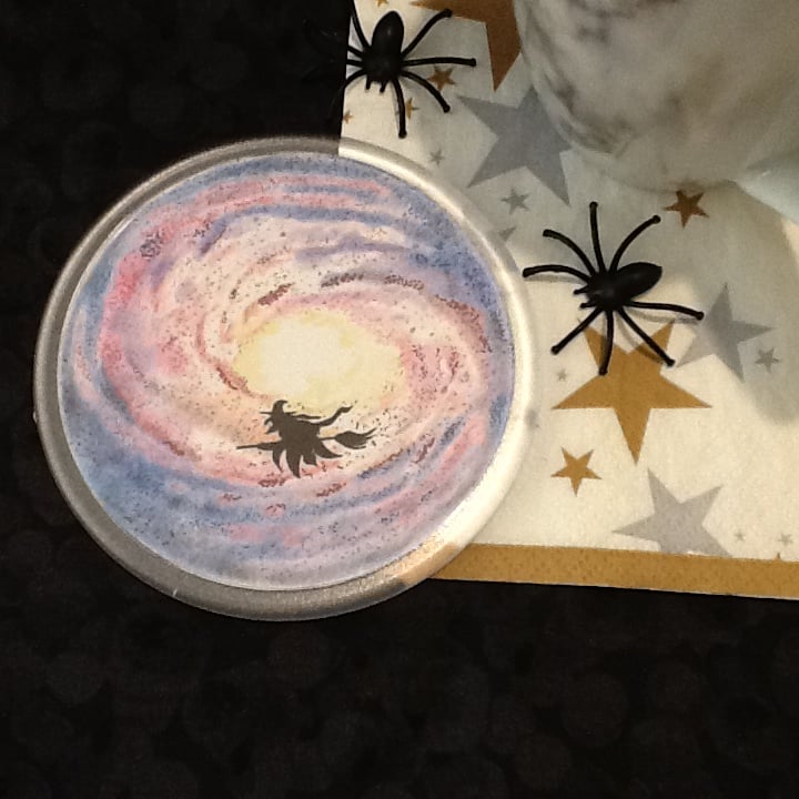 Crystal clear acrylic coasters with prints made from original drawings I did of Halloween witches on their travels, the originals were drawn in a mixture of pencil crayon and pen.