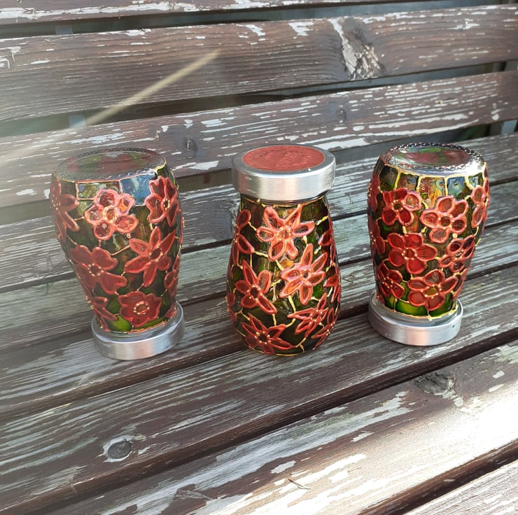 This is a hand painted up-cycled jar tea light holder which can be used with a real flame or a battery candle. I am selling them as a set of three so they would be great as a table centre- piece at Christmas!