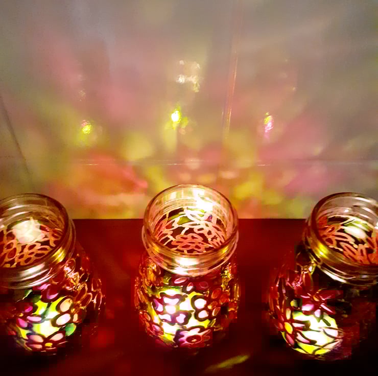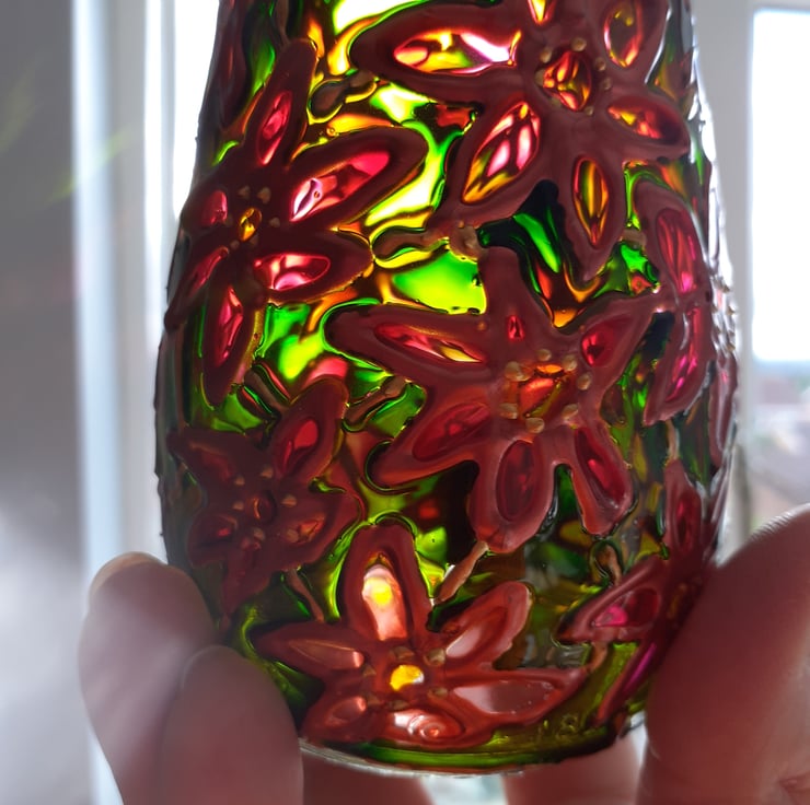 The design has been drawn using out-liners and then each section has been filled with transparent glass paints drop by drop! The colours are bright and will look good without a candle in them and will look even better in bright sunshine!