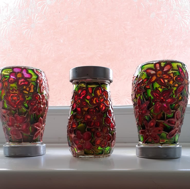 These jars are such a lovely shape and it seems a shame to throw them away. I have hand painted them as candle holders or sun catchers and hope they are given a new lease of life!