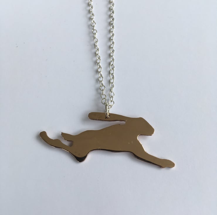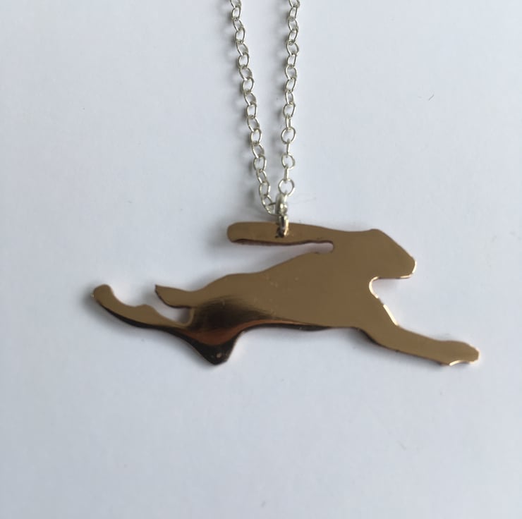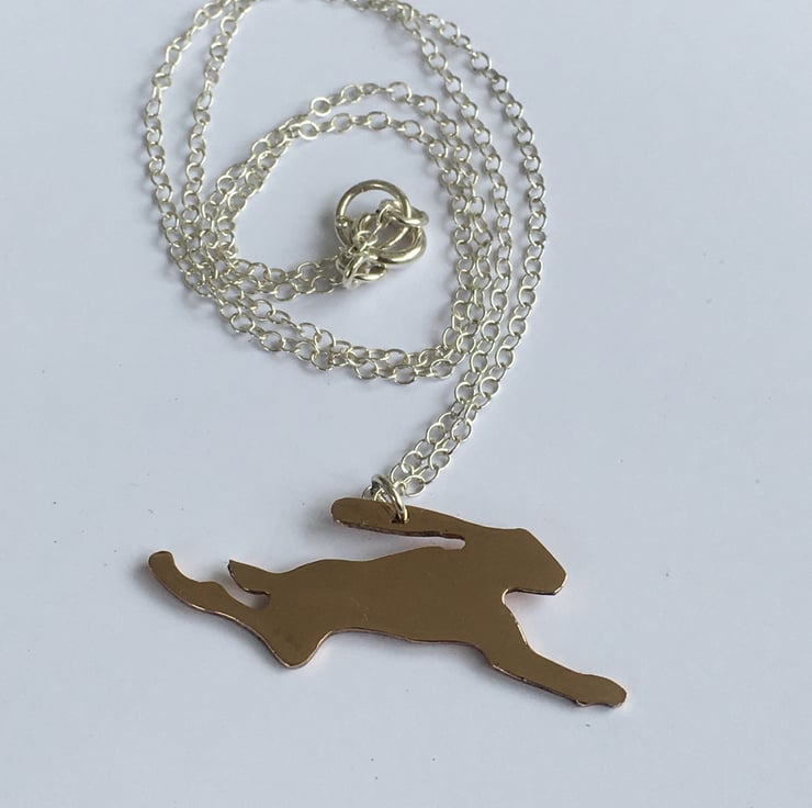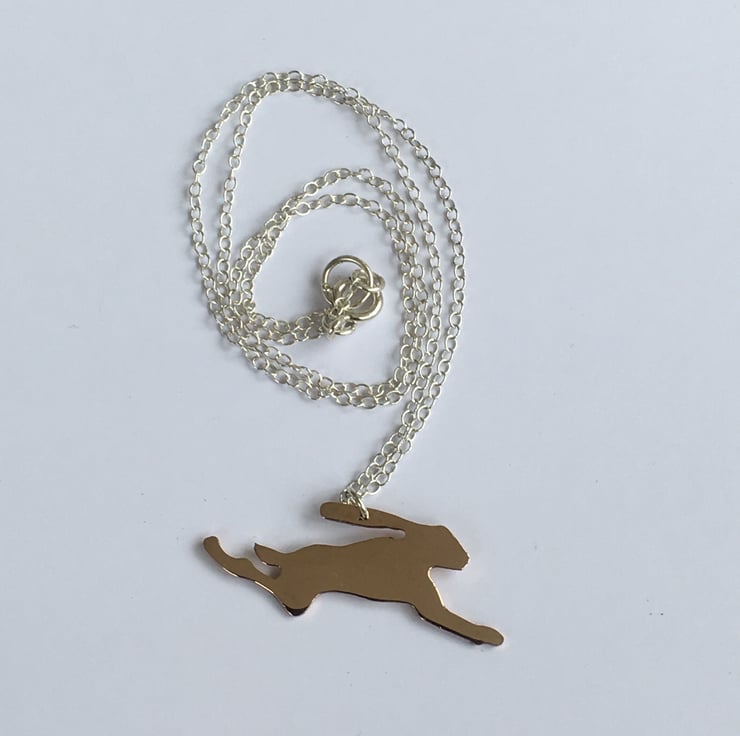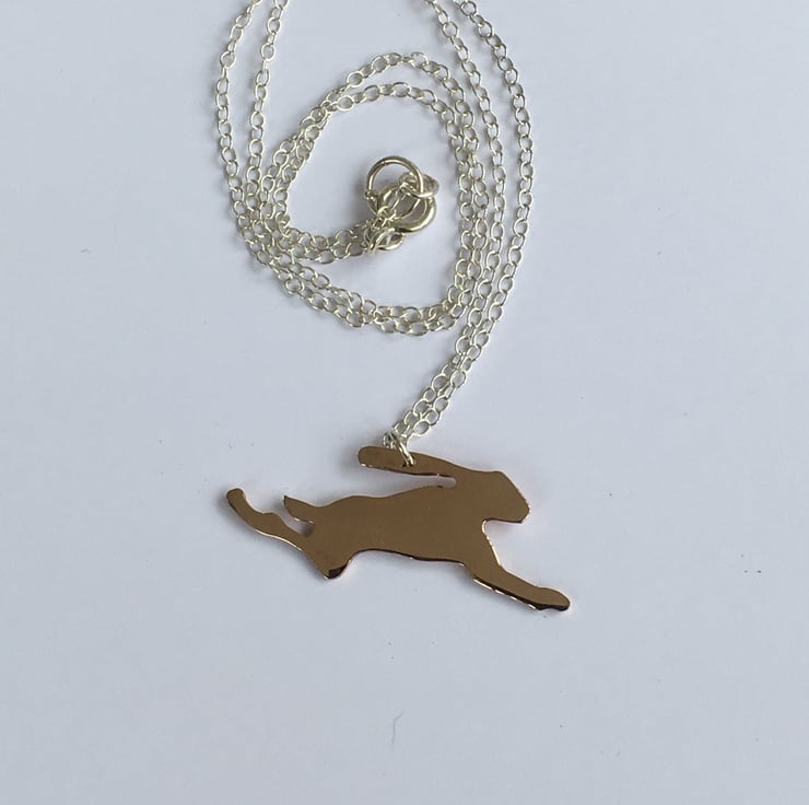 The Hare has been pierced out from Bronze sheet by hand, all of the connections and chain are Sterling silver.