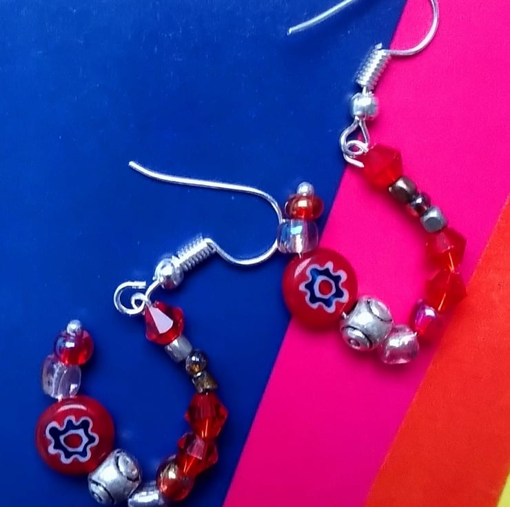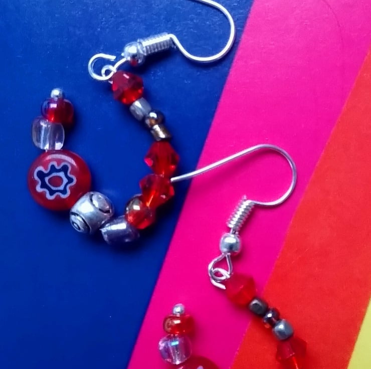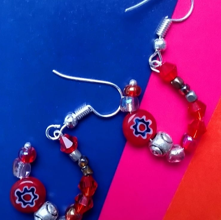 Curvy beaded earrings made with a lovely mixture of tiny red glass beads in different shades and sizes, mixed with a small decorative Tibetan siver bead and a Millefiore glass bead with a blue and white flower running through. Hanging on a sterling silver nickel free hook. Catch the light in a really lovely way. Free UK postage.