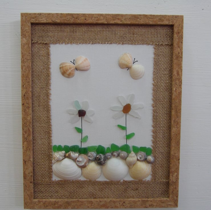 A cute little summer garden picture made with Cornish and Dorset sea glass, pottery and shells, featuring sea glass flowers and shell butterflies.