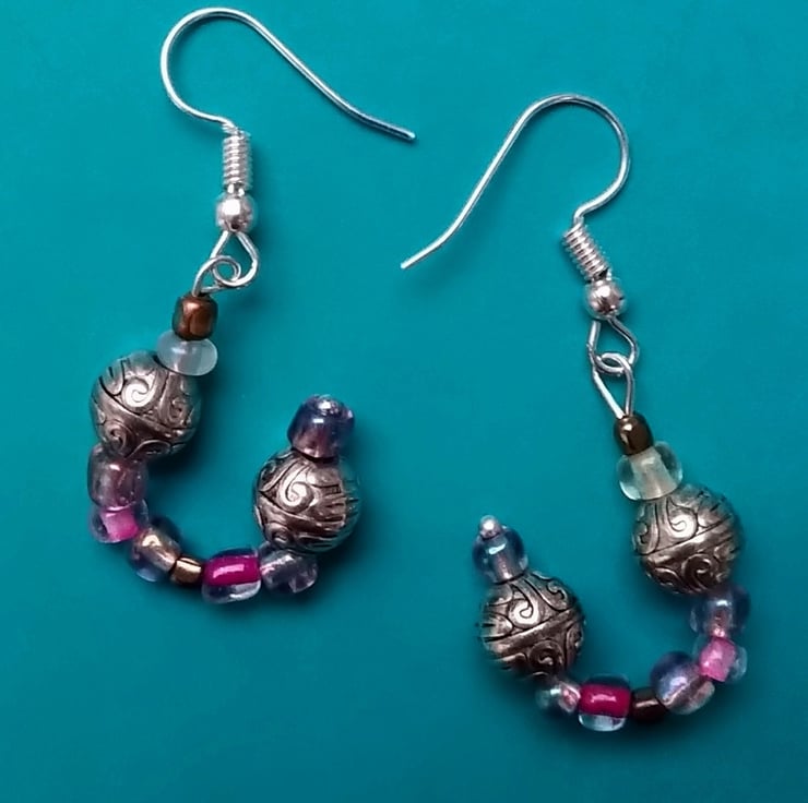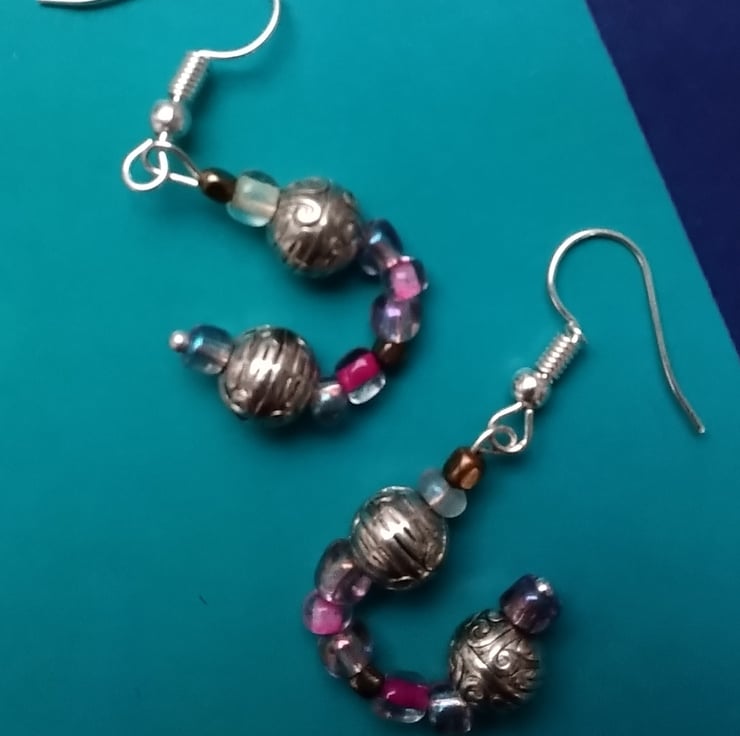 Hand beaded earrings in a beautiful curvy shape with an array of pretty pink tiny glass beads and round decorative Tibetan silver beads, hanging on sterling silver nickel free hooks. Free UK postage.