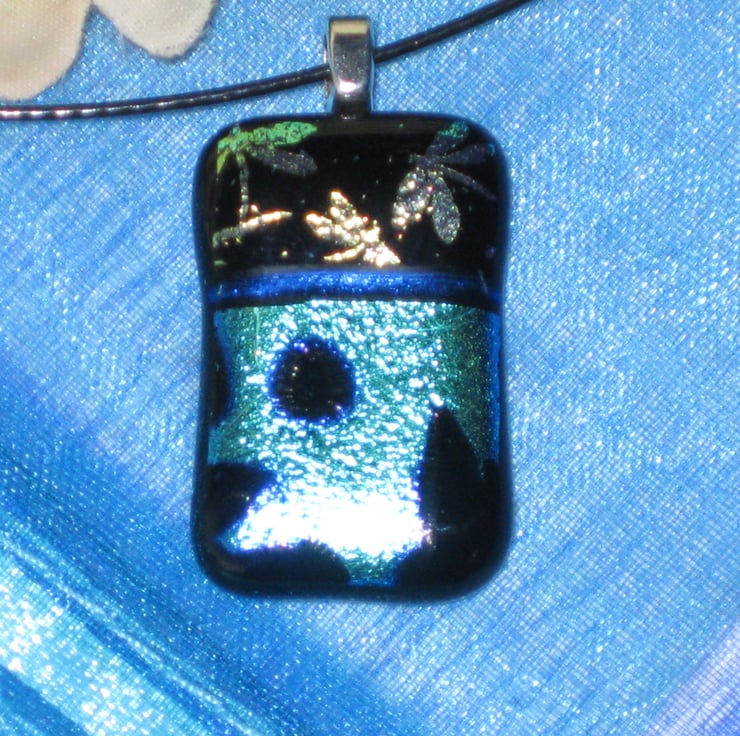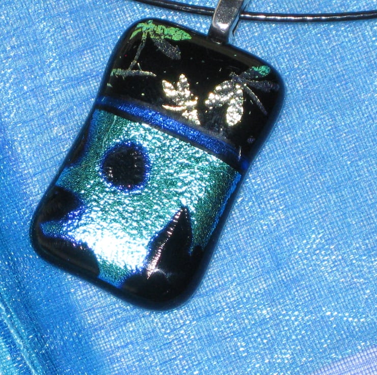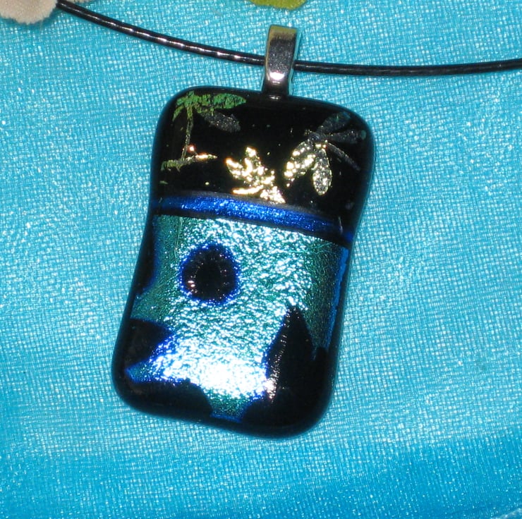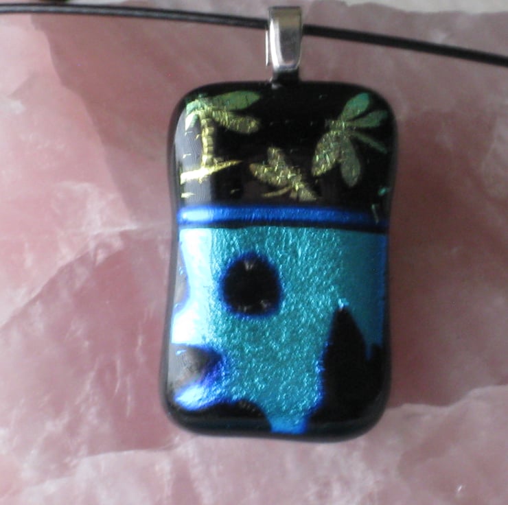For this piece I used two different patterns of dichroic glass for the top. A lovely aquamarine blue with black splatter pattern (for the lower half) and a dragonfly pattern (black and gold) for the upper half.