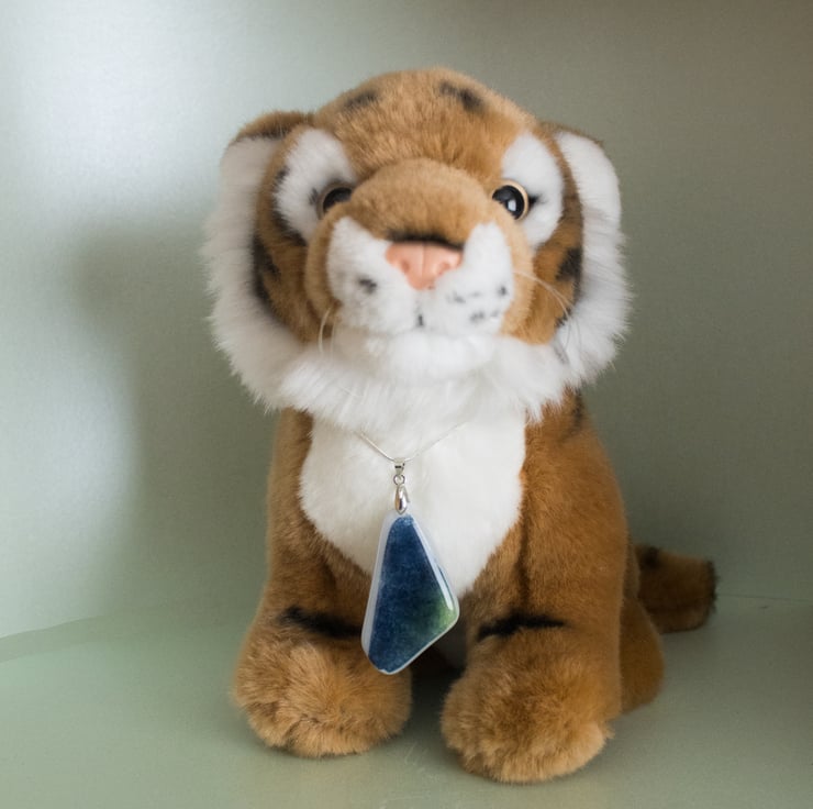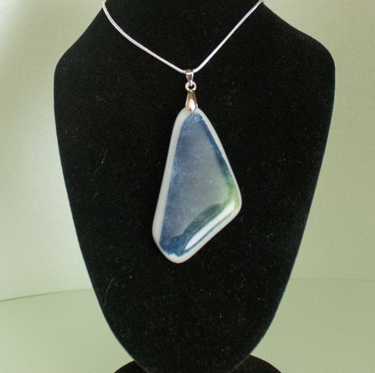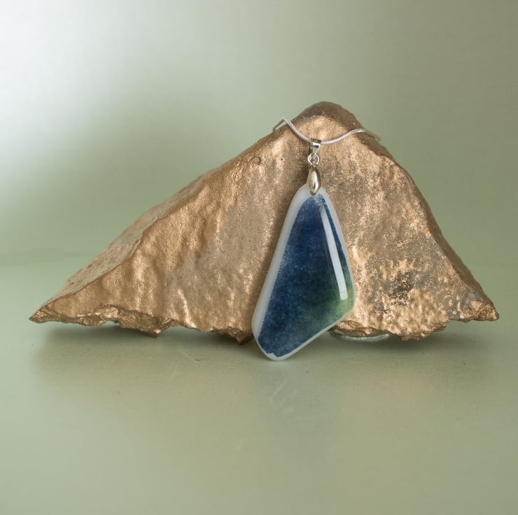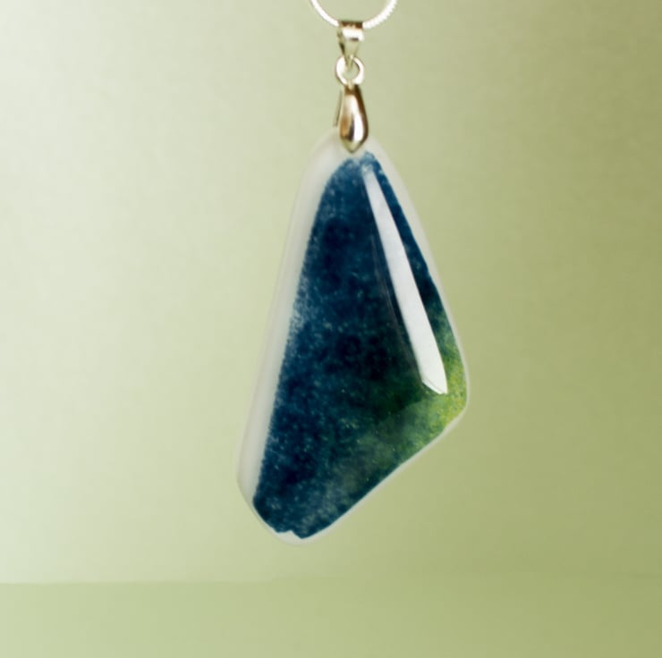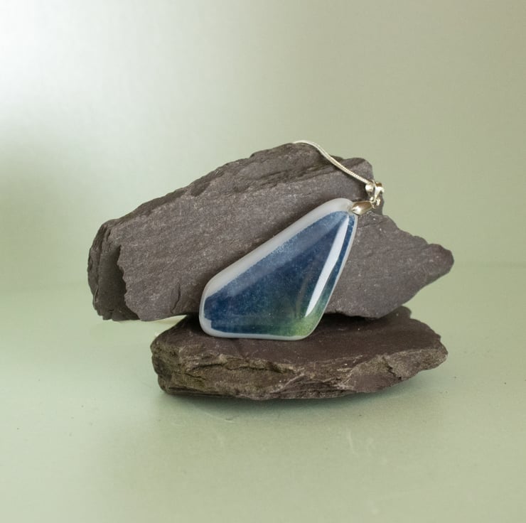 A lovely new design in Fused Glass, this triangular pendant features predominant blues, with flecks of green, and a white border.