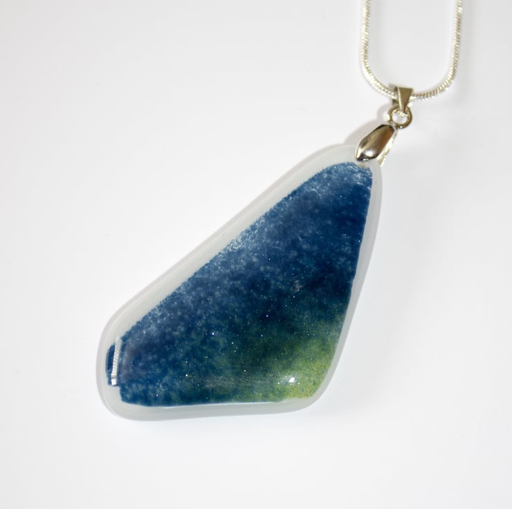 We start with hand-cut shapes of glass - a base white and a clear cap. Onto these, we sprinkle blue and green glass powder before a session in the kiln fuses everything together into a single piece of glass. When it's cooled down from 800c we drill a hole, fix the bail in place and thread the chain.