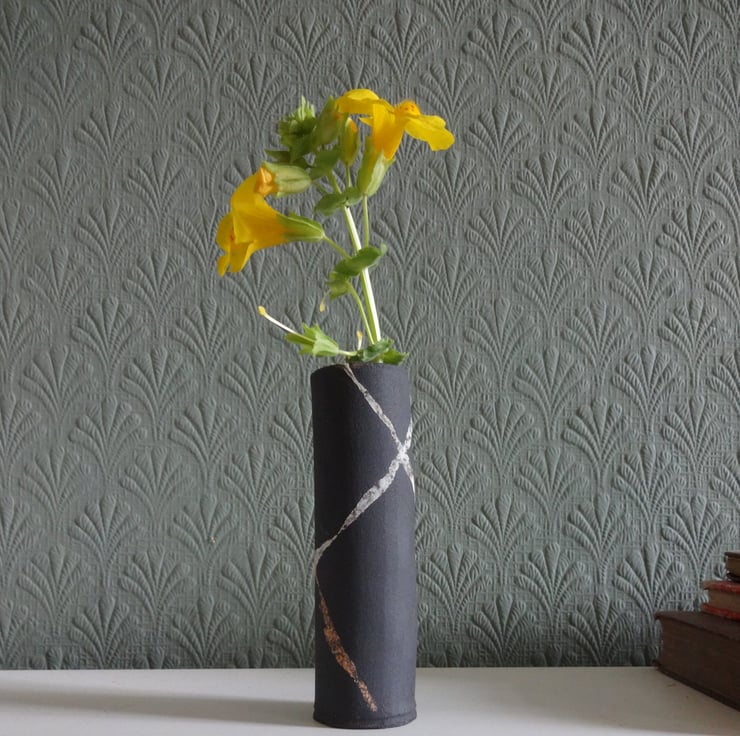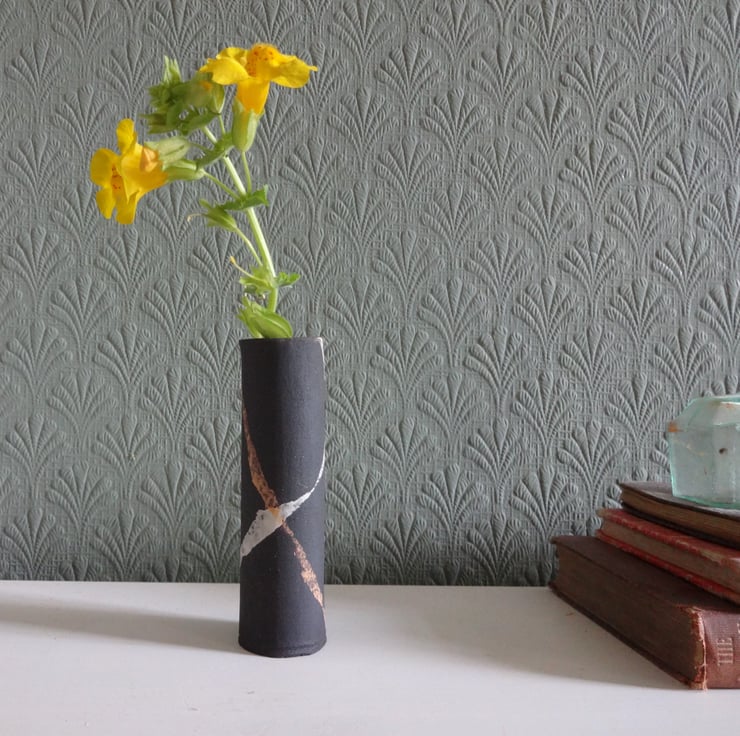 This collectable small vase is perfect for little flowers, posies, wildflowers, or herbs and sets off flowers in pastel shades particularly well.. Called Dinah the little vase will add a lovely touch to your living room, bedroom or kitchen. Handmade in matt black stoneware ceramic, the little vase has a natural black clay exterior and glazed interior, with swirling ribbon decoration in yellow and white. Cool and contemporary, Dinah is an eyecatching ceramic vase with a very modern feel. A touch under 11 cms high and 3 cms diameter approx. Match up with others from my ribbon themed vases, all with my potter's mark on the underside - a swallow in flight.