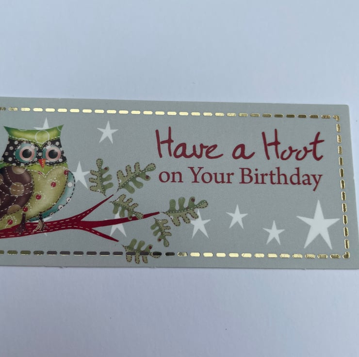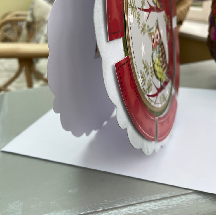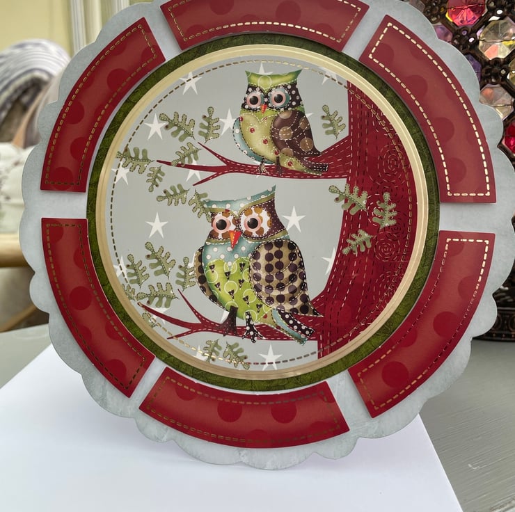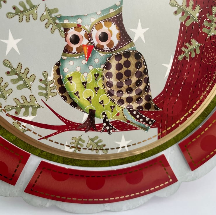 A unique round card that has the cutest pair of owls on the front. The shape of this card is very unusual. It is round with a large scallop but it stands up with no wobble. The edge had a circle of red and gold stitched borders. The main design is topped on gold and green circles. It has 2 cute owls sitting on a styalised tree branches. They are made up of different printed patterns of fabric, this makes them very patchwork in look. Inside has a matching topper with an owl on and the greeting Have a hoot on your birthday. A beautiful and different birthday card for an autumn birthday, it really could be for a man or woman, whoever is an owl nut! The envelope size is 20x20cm in size, the card is approximately 19.5cm across.