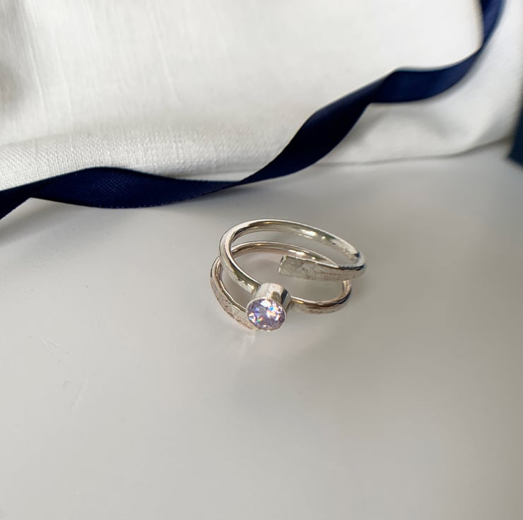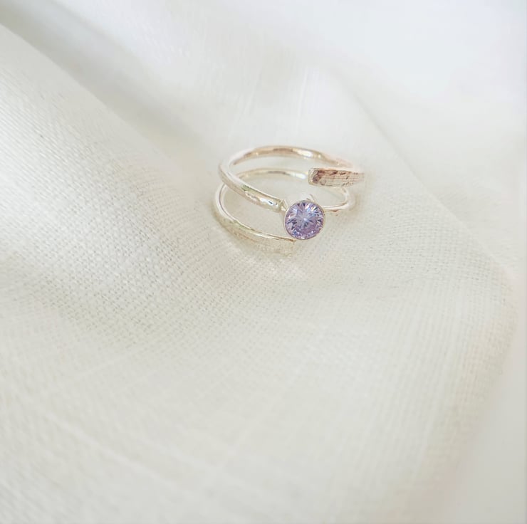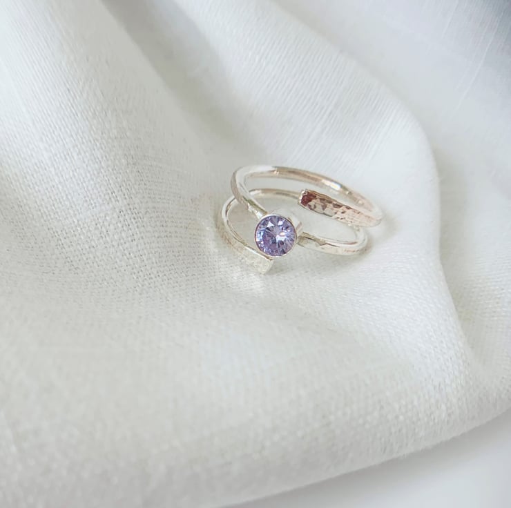 The ends of the wire have been flattened and shaped and the central band has been set with a beautiful 5mm pale lilac cubic zirconia stone.