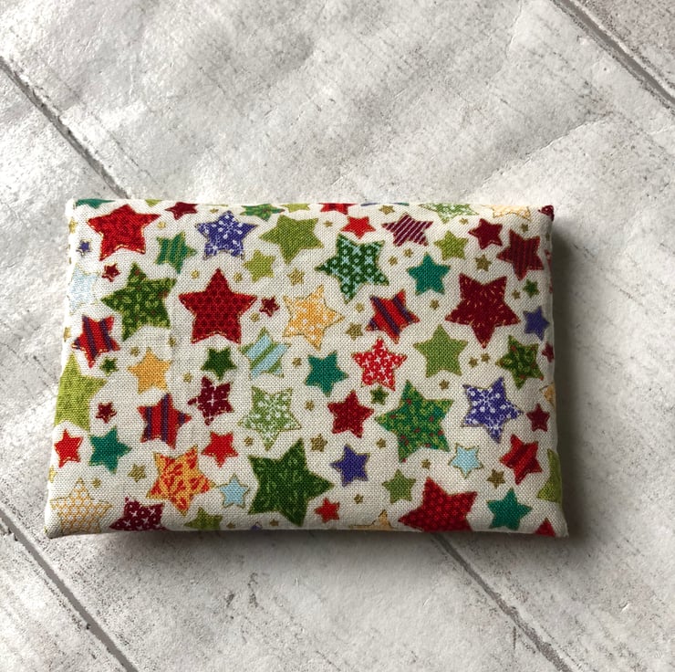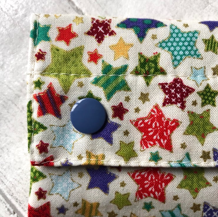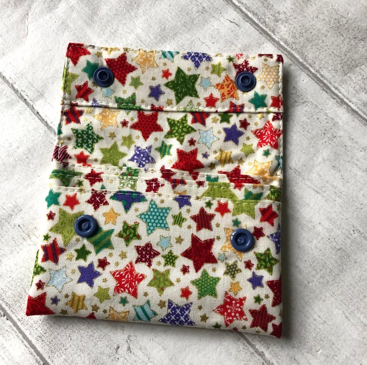 This little cotton fabric wallet has a busy star design in shades of green, red, purple, gold and blue.