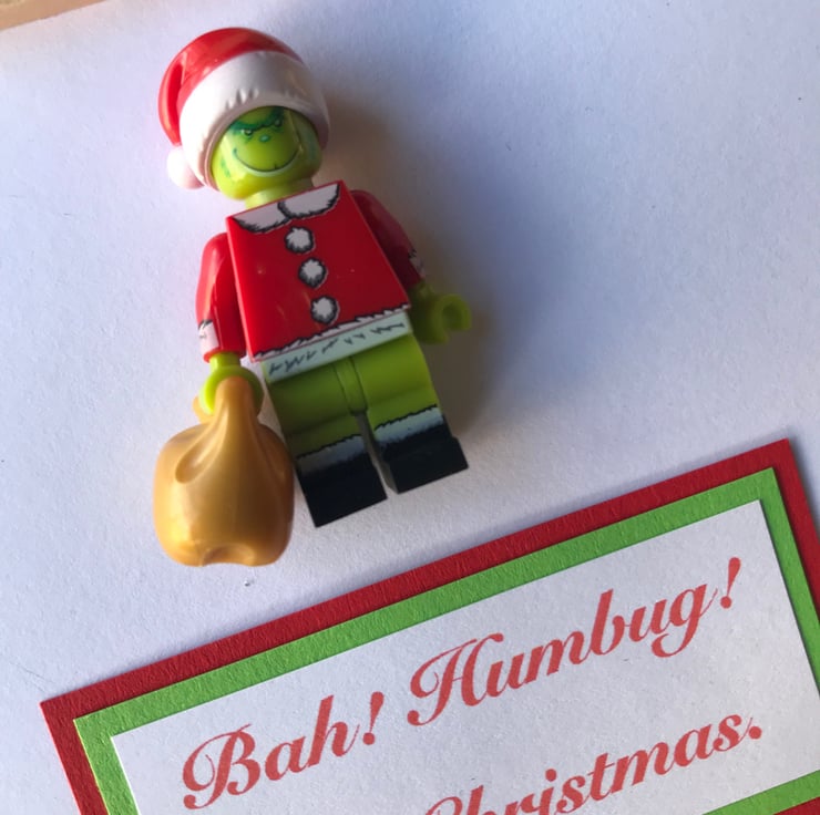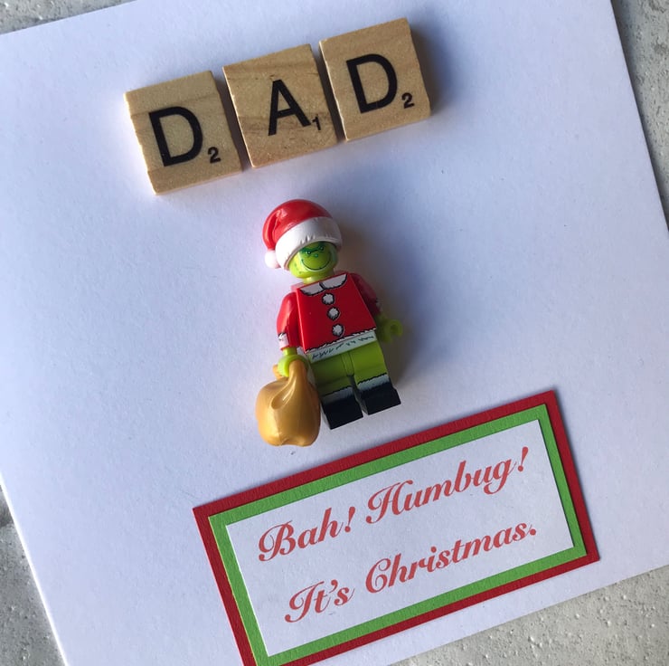 Made by myself in Northamptonshire it features wooden scrabble tiles and your a Grinch mini figure which are stuck onto 300gsm white card stock. A printed greeting of your choice is added and the inside is left blank for your own message.
