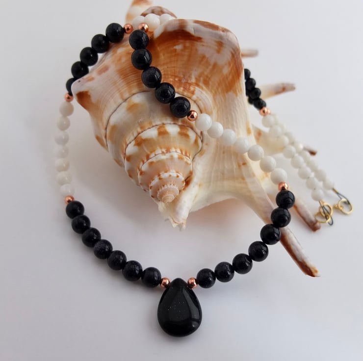 The necklace graduates to white shell with a subtle shimmer of mother-of-pearl, and smaller aventurine glass beads punctuated with small beads of solid copper.