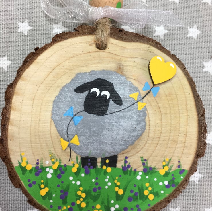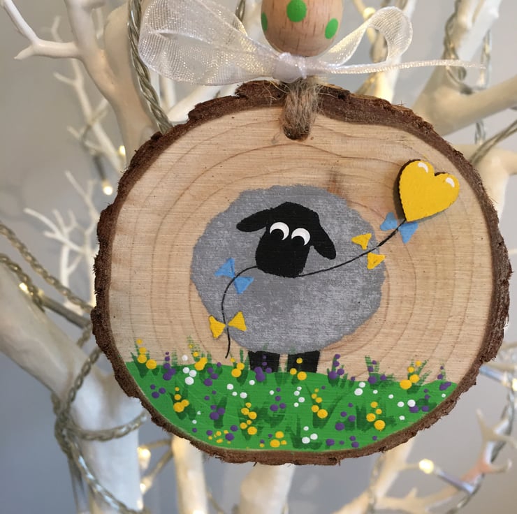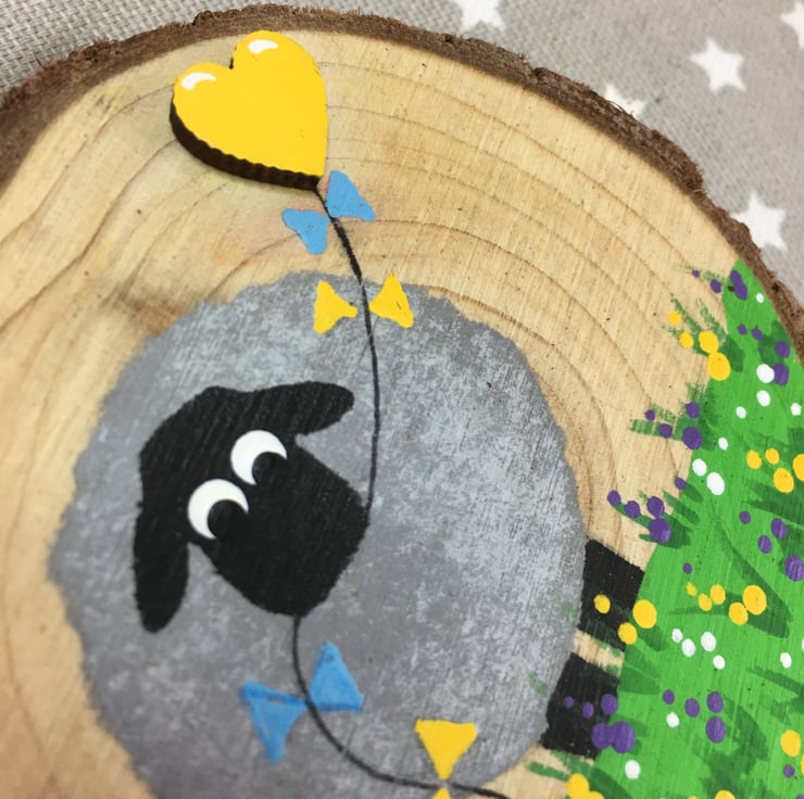 This hanging decoration features a cute sheep standing in a flower filled field, flying a yellow ‘kite’... which is a painted wooden heart so is raised from the surface.