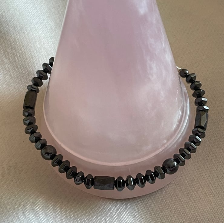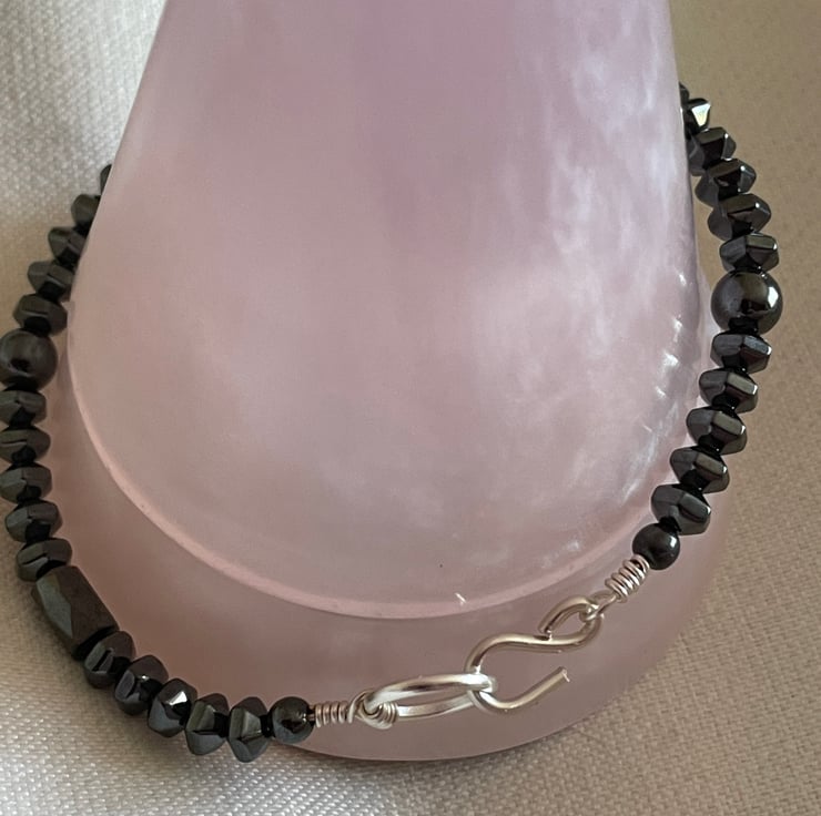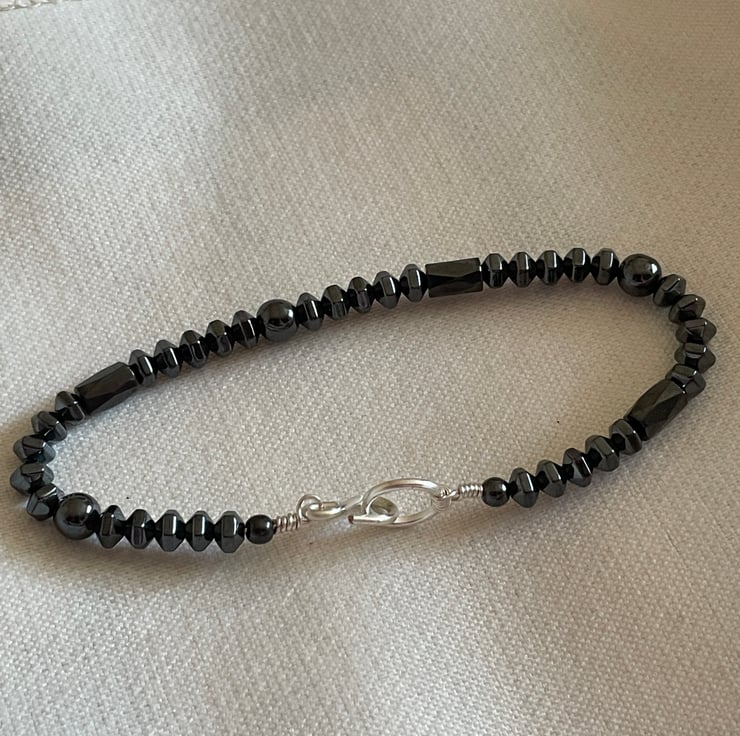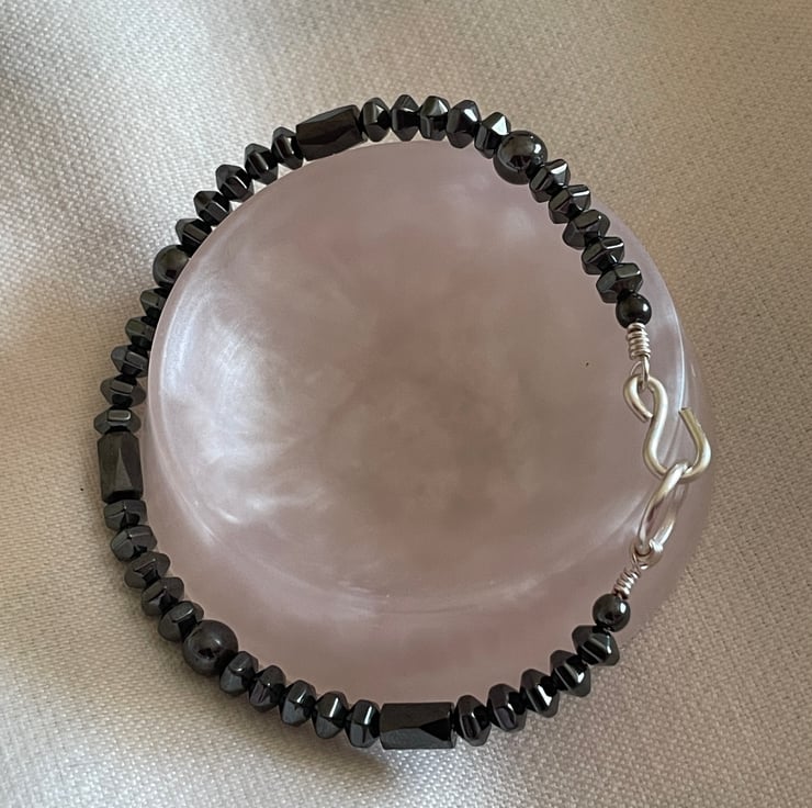 Made with a combination of both, magnetic and non-magnetic hematite beads and silver plated copper wire. Designed with an S hook fastening. Sold individually, but bought with others it could be worn as a stack too (as demonstrated in the photos)