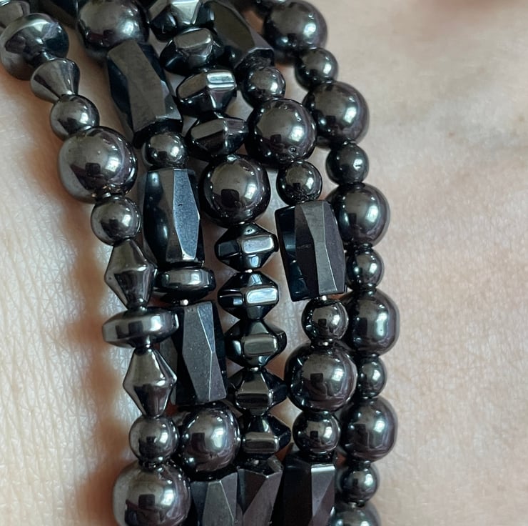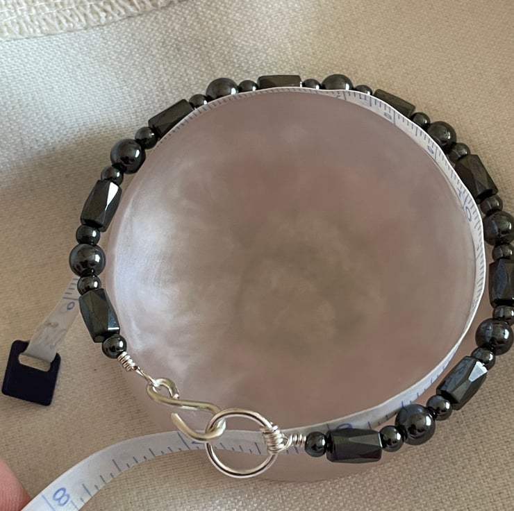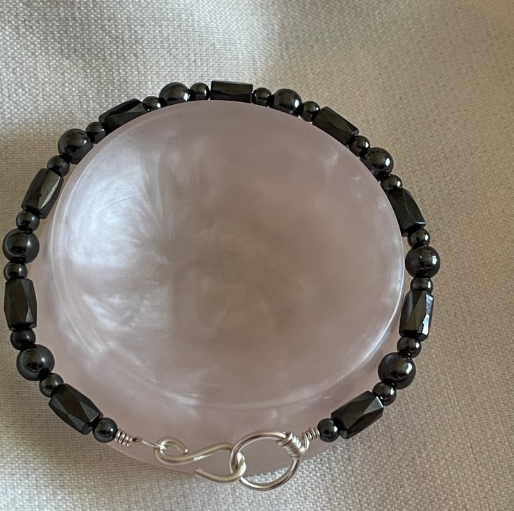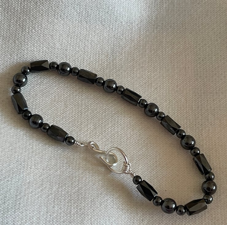 Made with a combination of both, magnetic and non-magnetic hematite beads and silver plated copper wire. Designed with an S hook fastening. Sold individually, but bought with others it could be worn as a stack too (as demonstrated in the photos)