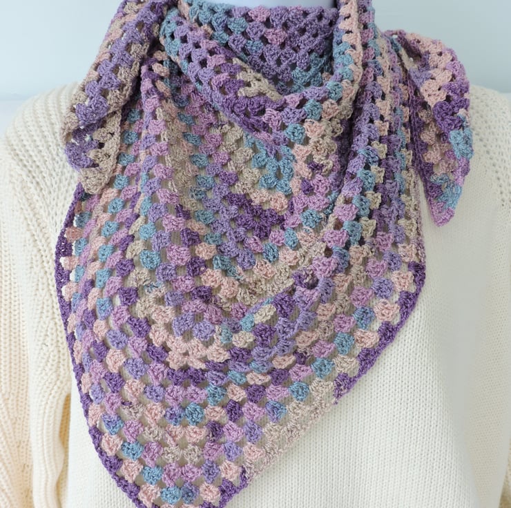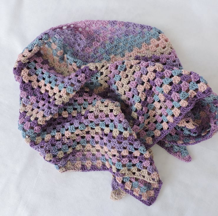An end of line Seconds Sunday item. This lightweight crochet shawl has been made with a bamboo and cotton yarn. Lovely graduated colours of purple, lavender, aqua, cream and pale pink. The longest side of the shawl measures 44ins (102cm) and the measurement from neck to point is 20ins (51cm). Soft and supple makes this perfect for the spring, summer, autumn or evenings.