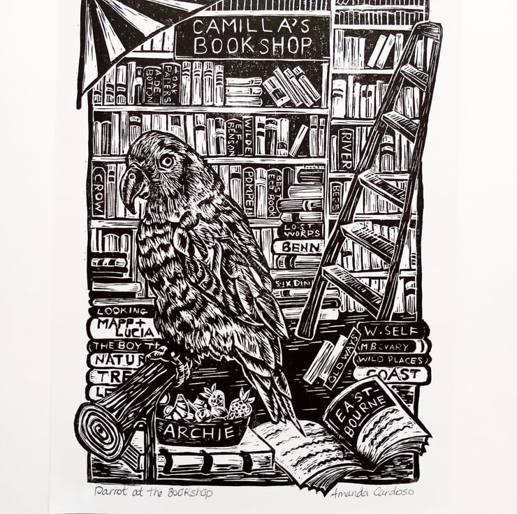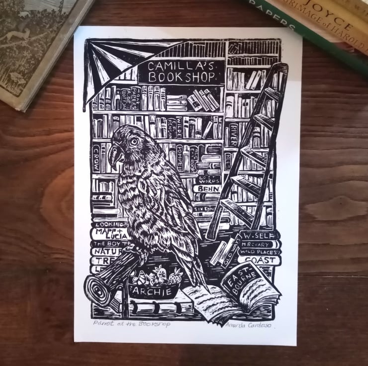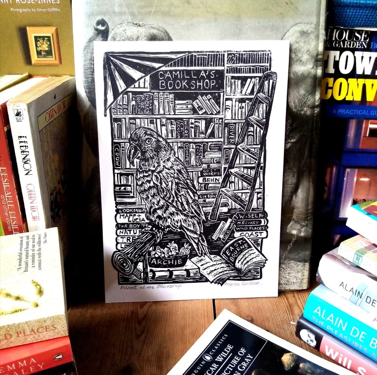 “Parrot at The Bookshop” is an original linocut print. Each print is handprinted, and then hand burnished (with my trusty wooden spoon!) in my Sussex studio. This is one of an Open Edition of signed prints.
