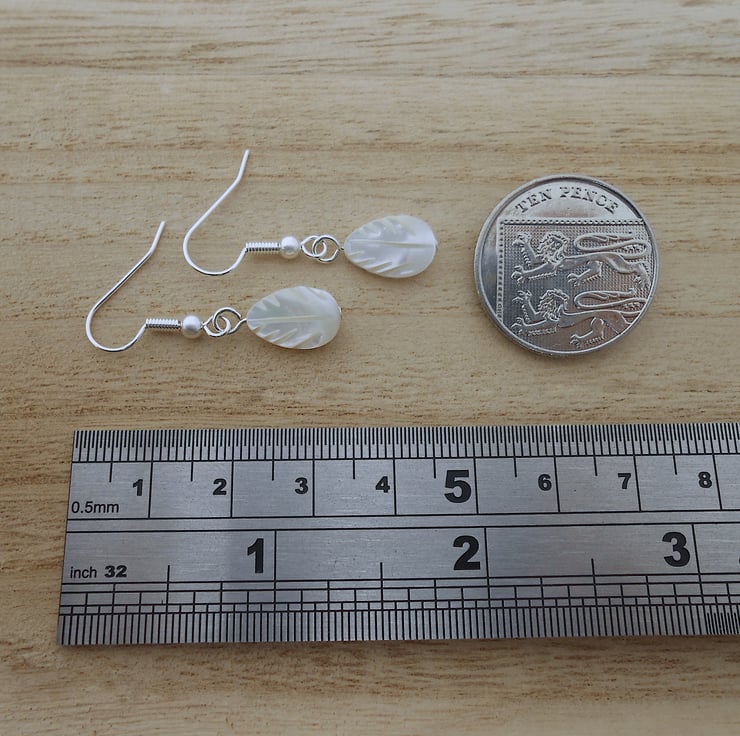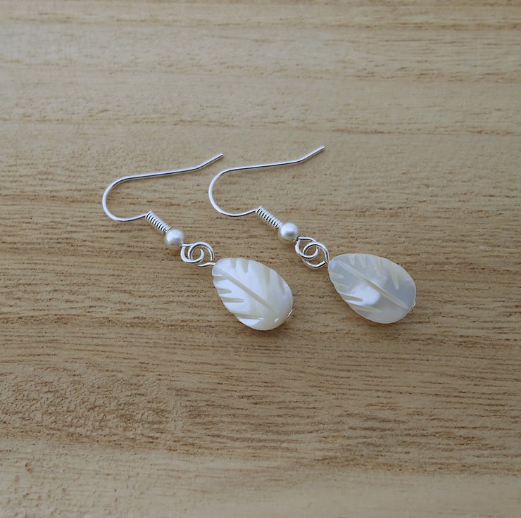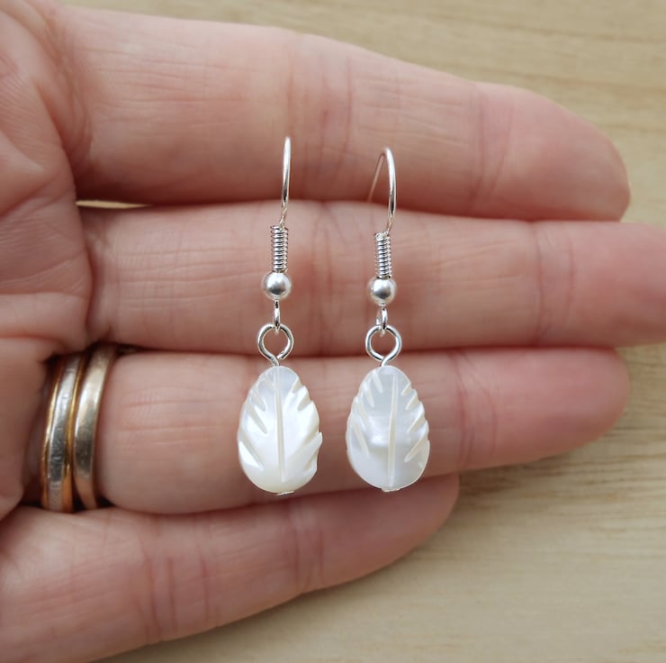 Mother of pearl earrings. These dainty leaf earrings have a silver plated finish, ideal for daily wear. They drop 3.5cm and the mother of pearl leaves are 12mm in size. They come wrapped in a handmade pillow box - ready to give as a birthday gift or as a self gift.