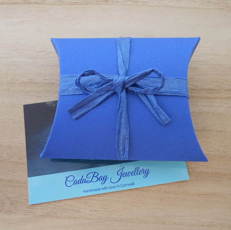 Your earrings come with a handmade royal blue pillow box that is fastened with paper raffia ribbon. I have designed my gift packaging to be recycled when you have finished with it.