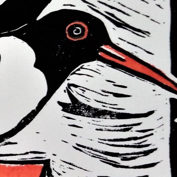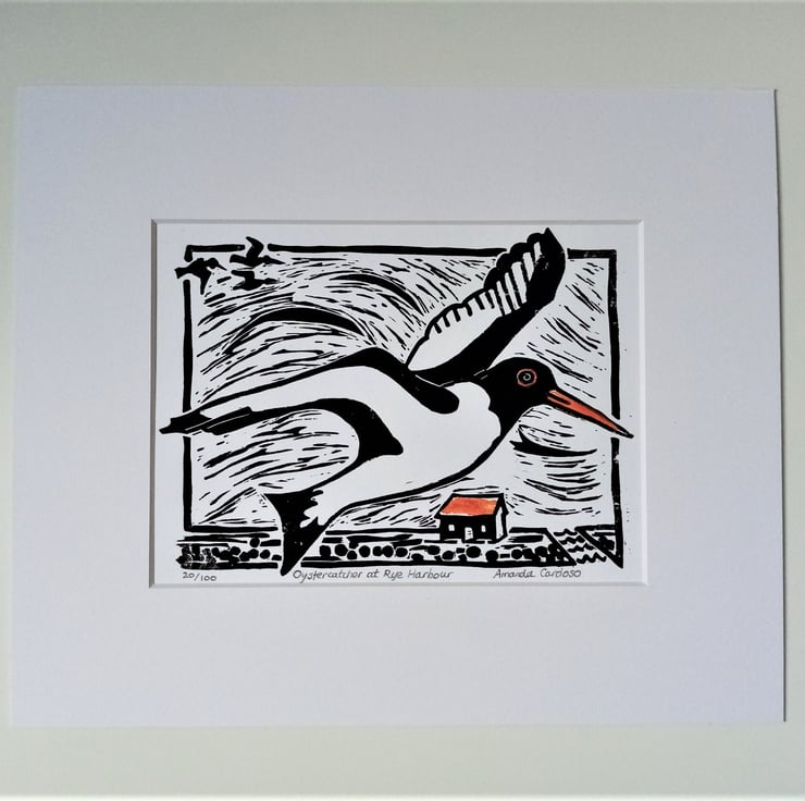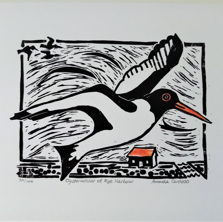 I love watching Oystercatchers and could not resist making a linocut piece to include one. This is a hand printed, hand burnished original linocut print which I have called "Oystercatcher at Rye Harbour” and is one of my “Birds and Places” series. Limited Print Run of 100 prints which are numbered and signed. I donate 5% of the purchase price to The Sussex Wildlife Trust.