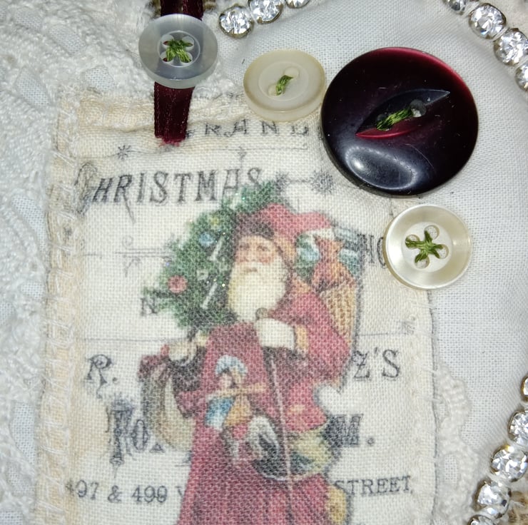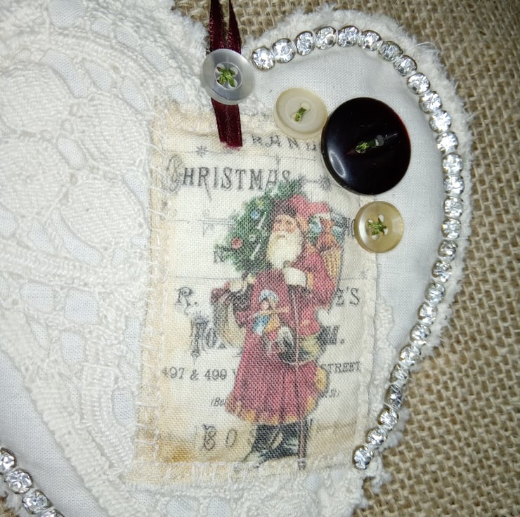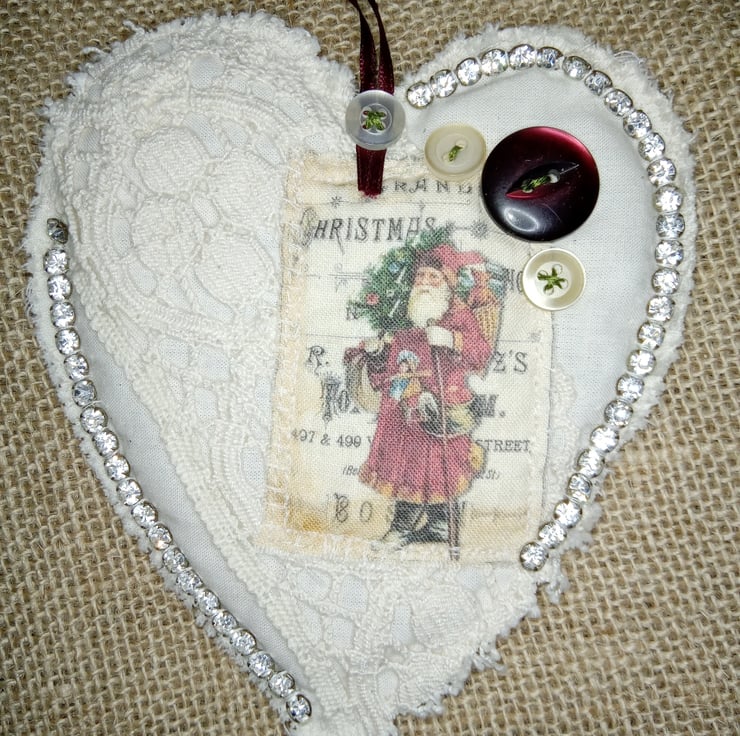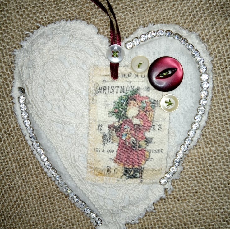 I have used a natural off white fabric and covered it with lace, sparkly vintage diamante, buttons and tonal buttons in off white and red. The main image is of Father Christmas carrying a sack of presents on the background of a Victorian toy advert. the heart decoration is plain on the back, slightly padded with a length of ribbon for you to hang it where you like in your home. It measures 13x14cm. From the top of the to the bottom point is 21cm's.