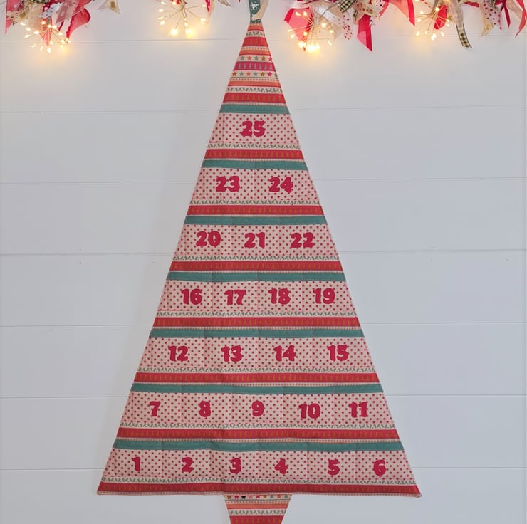 A colourful tree shaped advent calendar in shades of sage green, peachy pink and gold 100% cotton fabric. Designed to hold promises from one family member to another.The calendar comes with 25 shiny gold tags for you to write your own promises. The numbered pockets are big enough for little treats if you can't resist popping them in! Reusable year after year so a planet-friendly way to celebrate Advent. The calendar has its own hanging loop and measures approx. 17.5 inches/44 cm across the base and is 26 inches/66 cm tall. The calendar is backed with natural calico and has a layer of quilt batting to help it hang nicely.