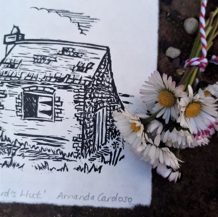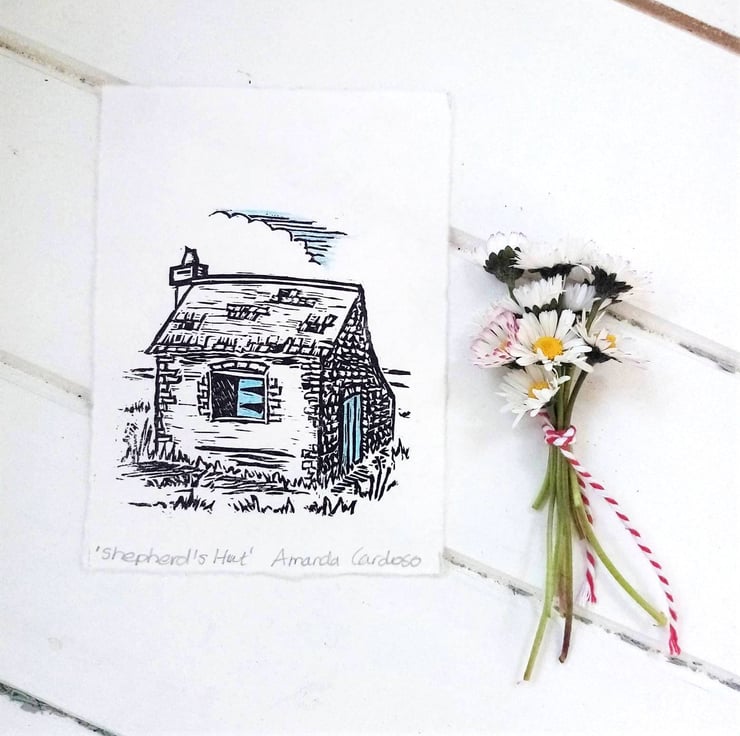Hand printed linocut print of a Shepherd's Hut. Each print is an original piece of art made by me in my Sussex studio. Choose either a pure black and white print or one hand coloured with blue.