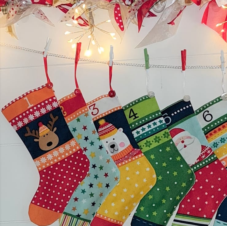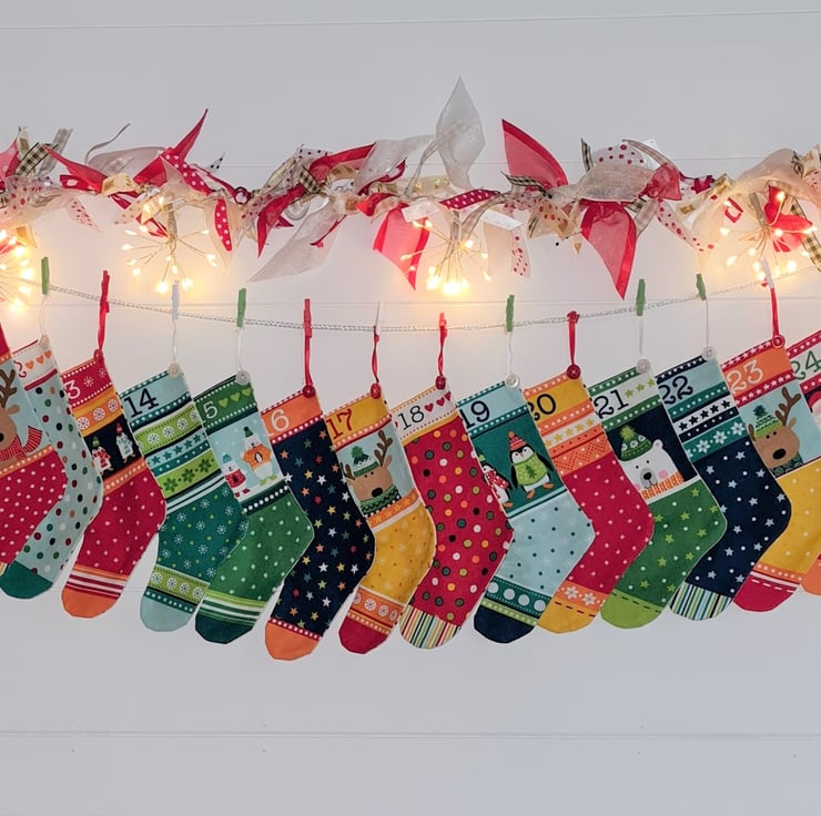 24 bright Christmas stockings pegged on a line makes a colourful Advent calendar that can be hung on a wall, up the stairs, across a mantlepiece or anywhere else you choose! The stockings are made from 100% cotton fabric and measure approx. 6.5 inches/16 cm long and 4.5 inches/11 cm wide. Plenty of room for those advent treats. Each stocking is trimmed with a little button and hung with ribbon. Reusable year after year so a planet-friendly way to celebrate Advent. The garland is approx. 47 inches/120 cm long, with extra string at each end for hanging.