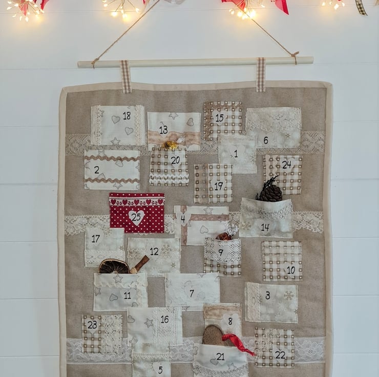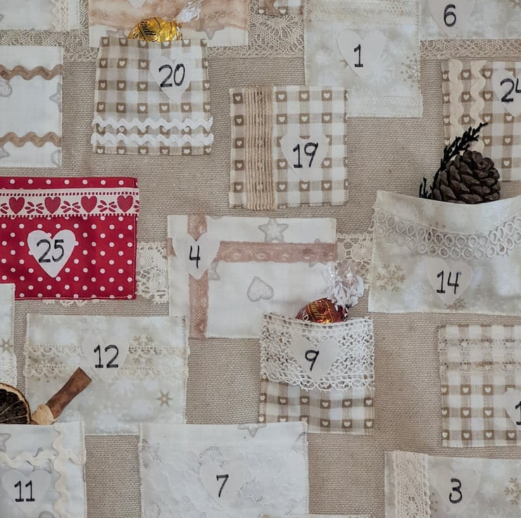 A beautiful hessian Advent calendar in natural shades of cream and beige. The pockets, made from 100% cotton, are trimmed with lace, ric-rac and ribbon and have numbers on natural calico hearts. Reusable year after year so a planet-friendly way to celebrate Advent. The painted dowel hanger and hessian twine are included. The calendar measures approx. 22.5 inches/56 cm tall and 18.5 inches/46 cm wide. The edge binding and backing fabric is natural unbleached calico. Pocket contents not included.