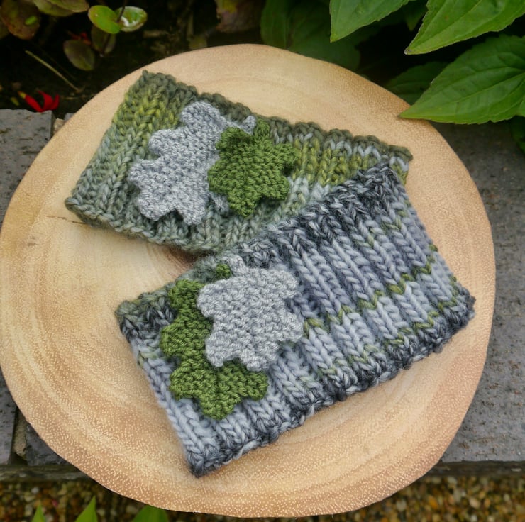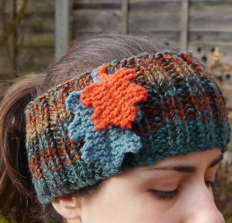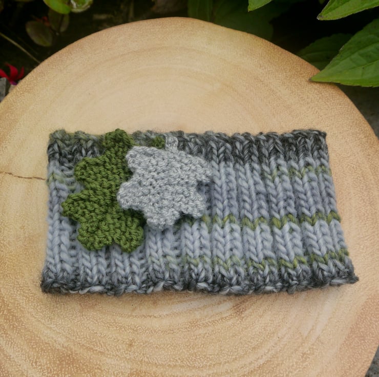 This lovely autumnal ribbed headband is hand knitted using a lovely chunky wool and acrylic mix yarn. I have attached two knitted oak leaves in complementary colours.