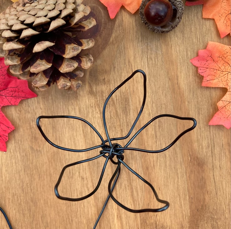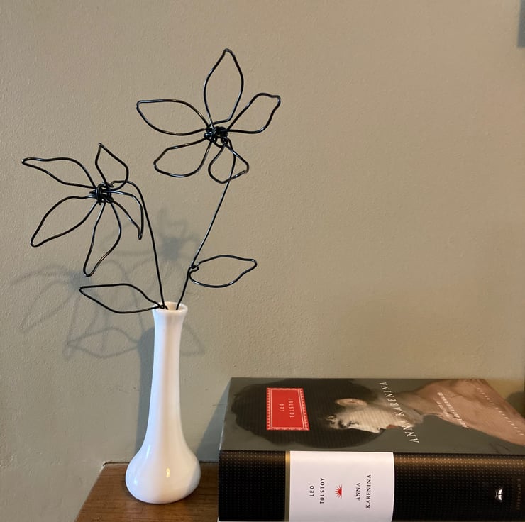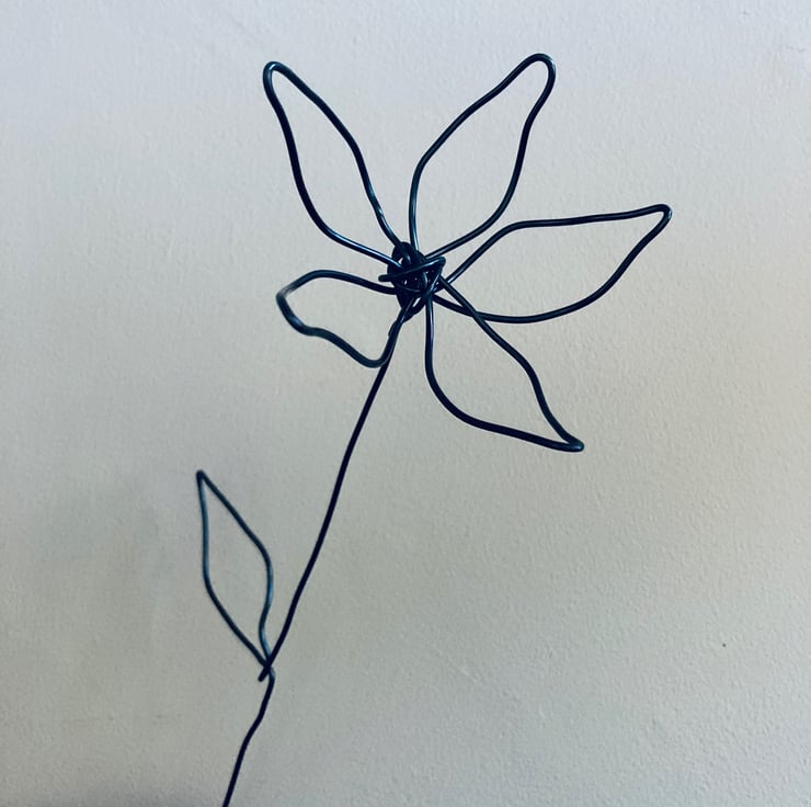 2 handmade black wire skeleton flowers. They look simply stunning in a bud vase or in an arrangement with other flowers. Optional white bud vase available, or you can choose to have them mounted in a reclaimed oak block. Each piece is a different length, the longest being approximately 28cm.
