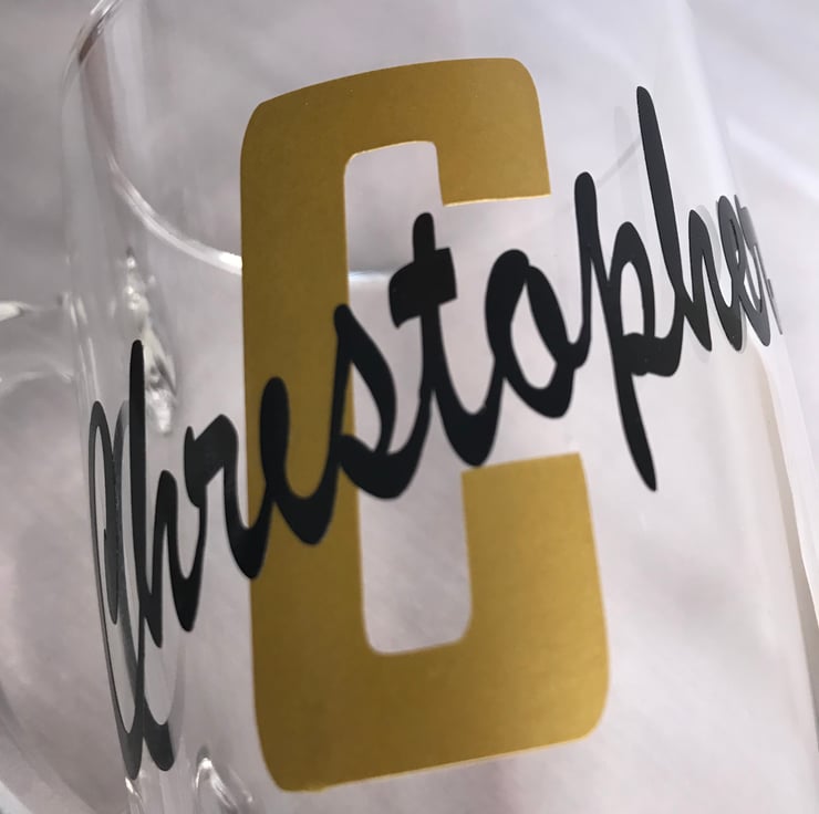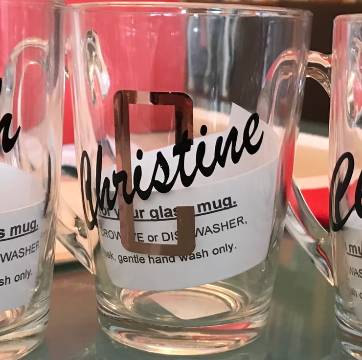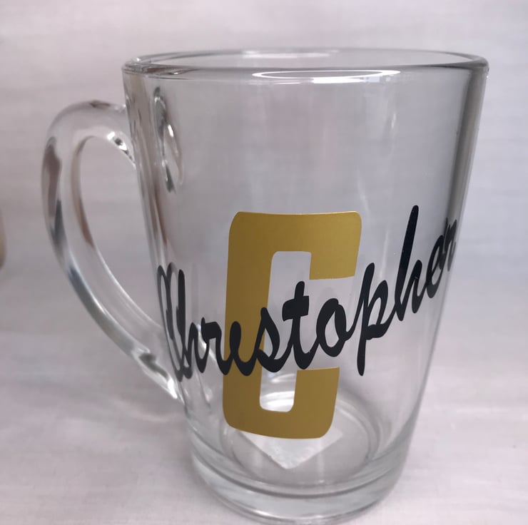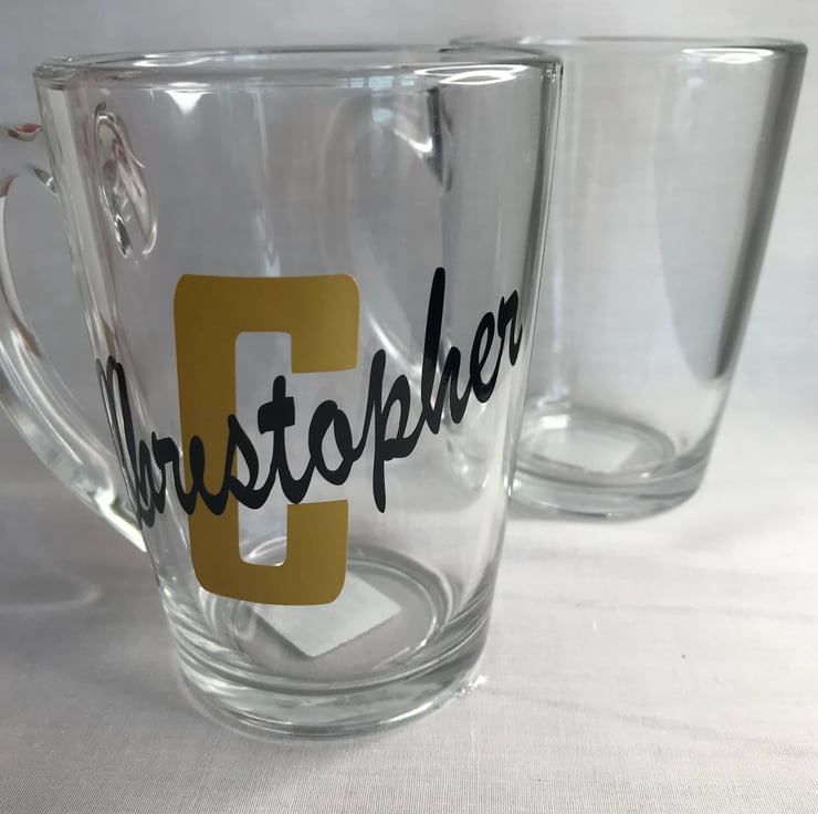 Glass coffee mugs with initial and name on in vinyl, perfect for tea or coffee.