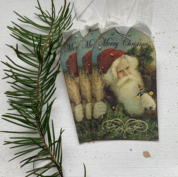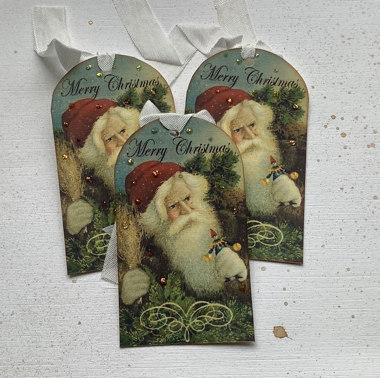 Lovely vintage image of Santa / Father Christmas/ St Nick , with the classic wording 'Merry Christmas'. I have printed these images on to high quality linen-look (285gsm) card .Of course there has to some shimmer! and so I have added the necessary ink, glaze and glitter .Finished with lovely ,silky ribbon !!