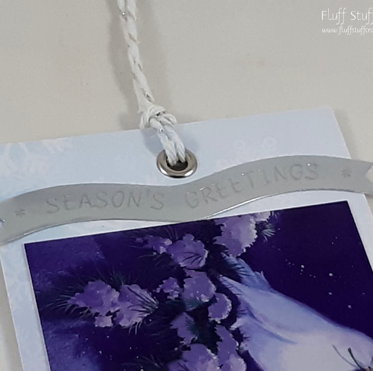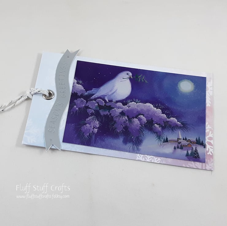 Pack of 3 gift tags, each featuring a mirri topper over snowflake background paper, with a dove resting on a snow covered tree branch, above a snowy village below. The sentiment banner reads 'Season's Greetings' and the reverse side is white card for your message.