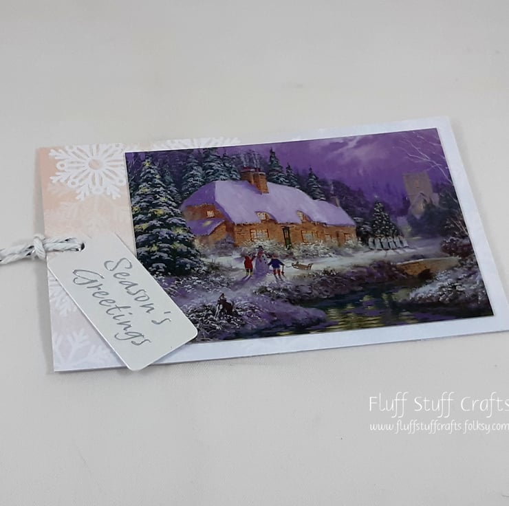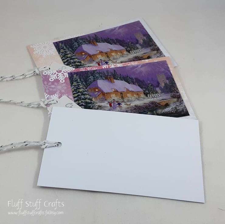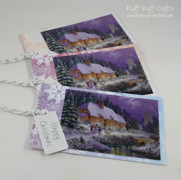 Pack of 3 Christmas gift tags featuring a mirri topper overlaid onto snowflake background paper. The topper features a cottage in a lovely snowy Christmas scene.