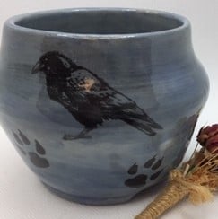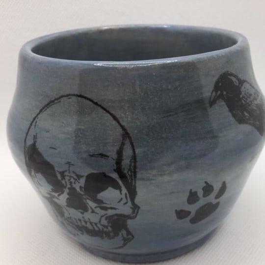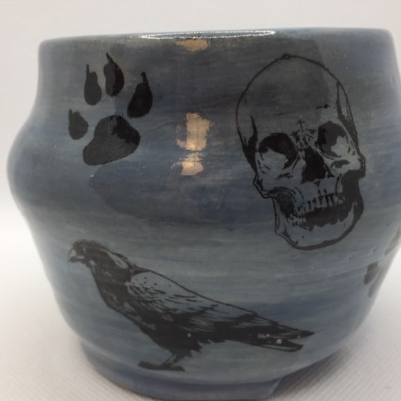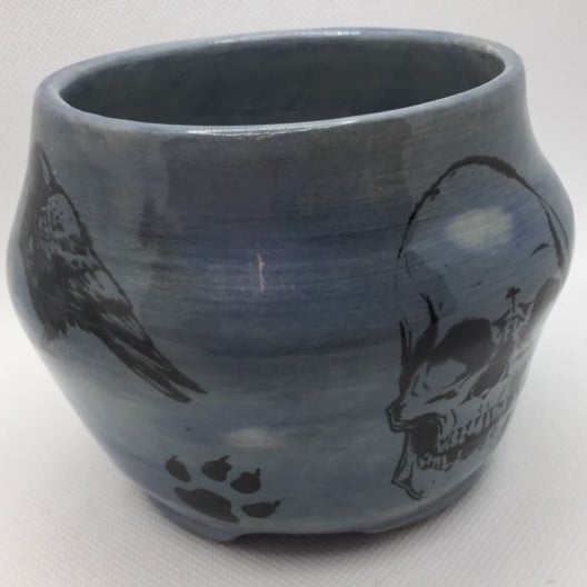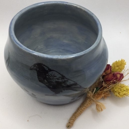 Versatile bowl with many uses. Can be used as a small vase, bowl or a decorative item for your Halloween table! Decorated with ravens and skulls. Hand thrown on the wheel in stoneware clay which is brushed with blue slip to colour the clay. 3.5 inches tall and 3.5 inches across.