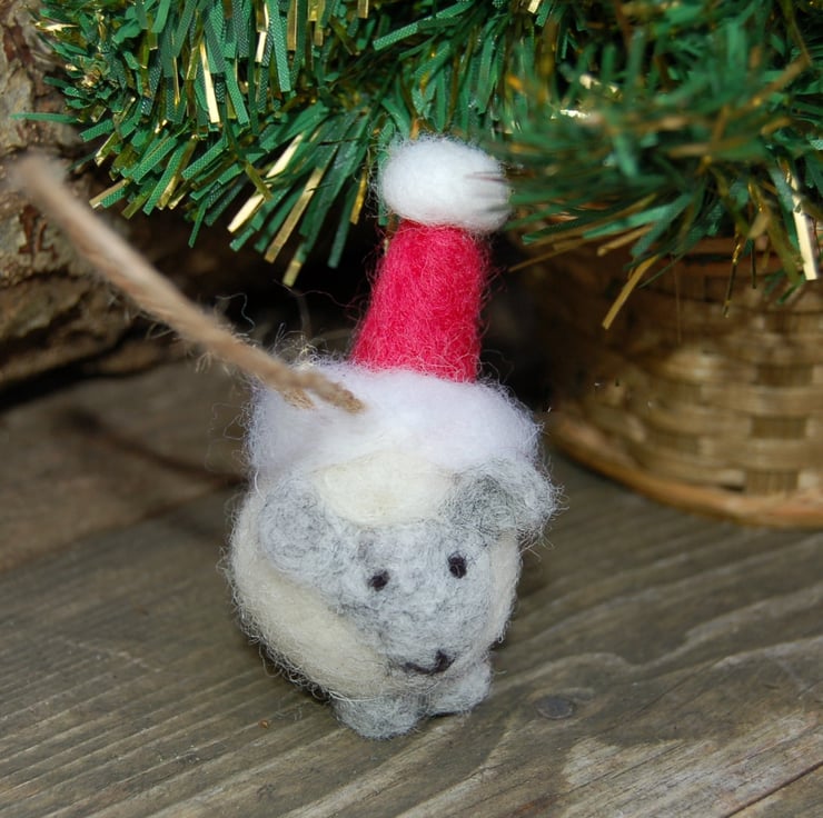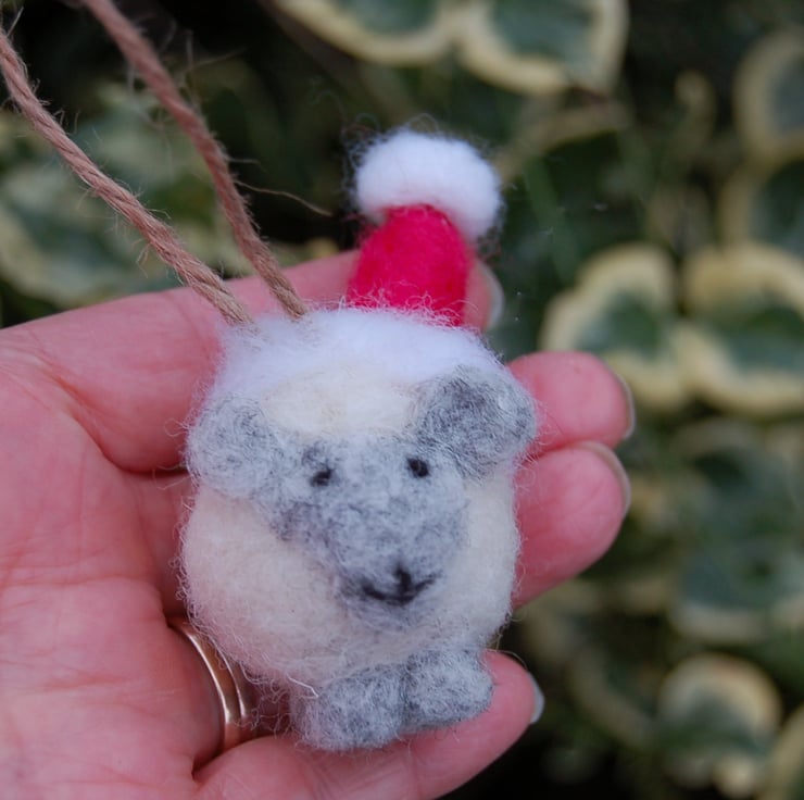 I have used unspun wool fibre and a sharp needle to produce a round shape. Using a fine sharp needle unspun wool fibre has been added to create the face, legs and Santa hat.