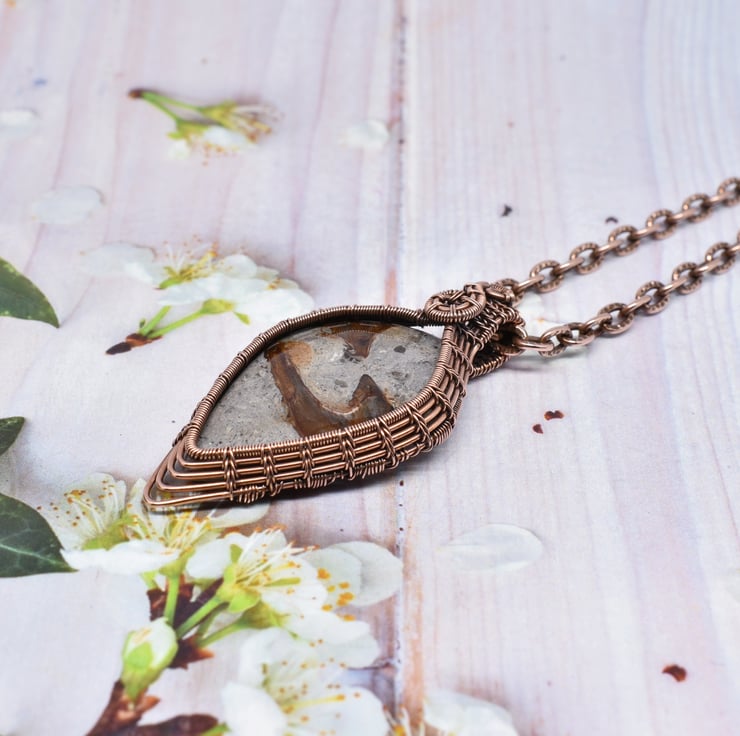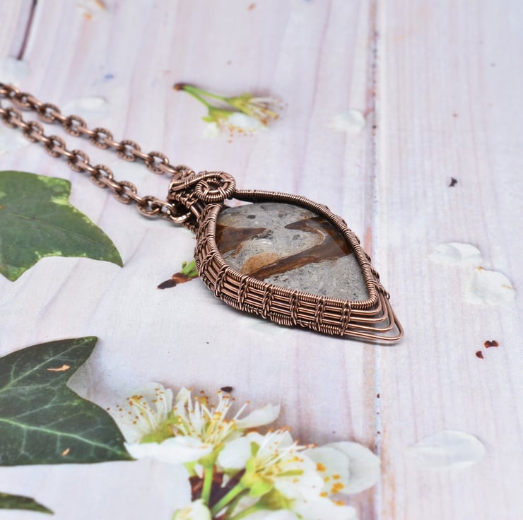 This striking unisex pendant is woven by hand using solid copper wire around the stone, I added a woven bail to complete the pendant.