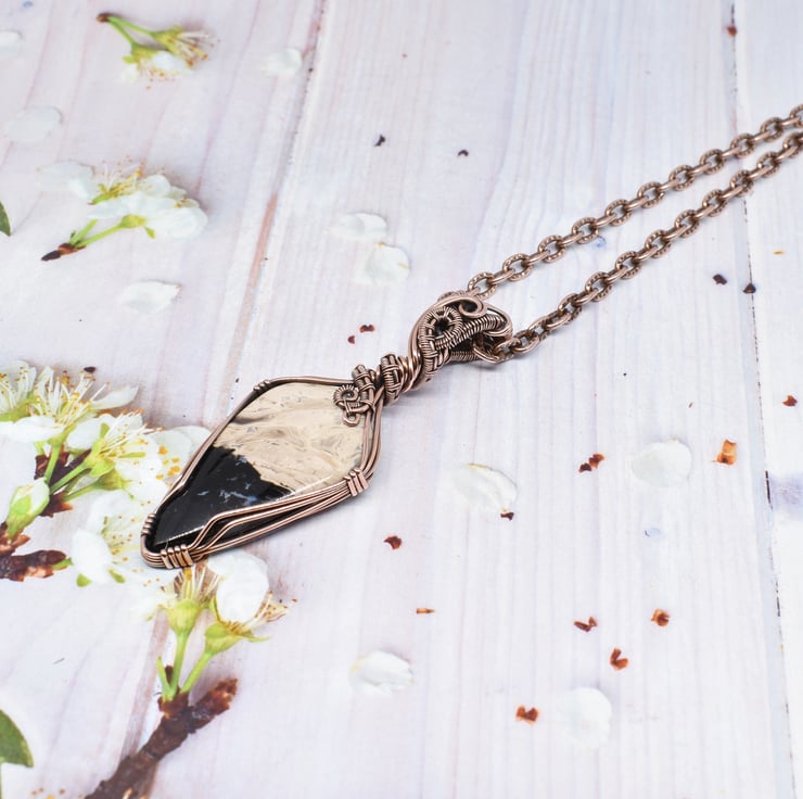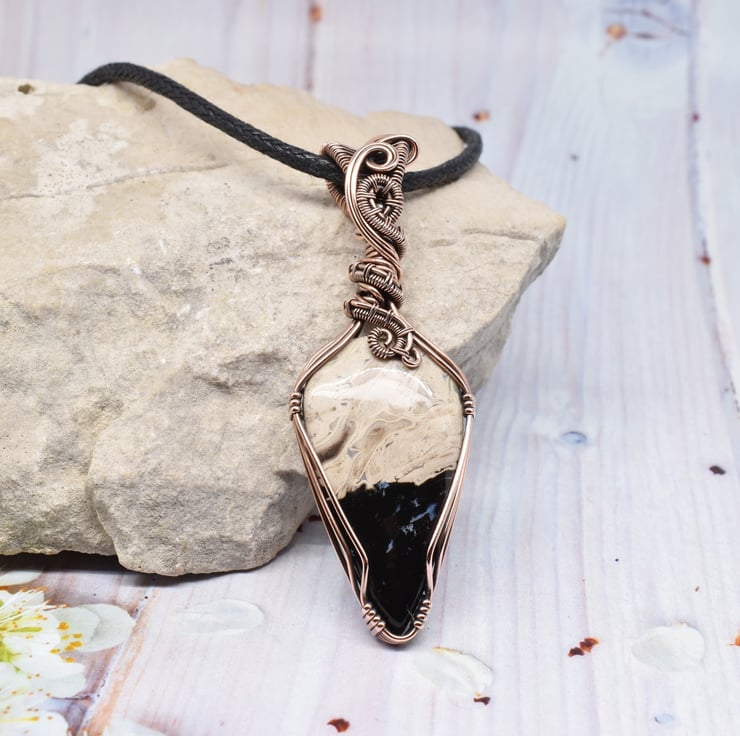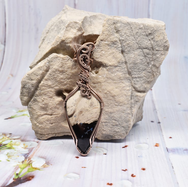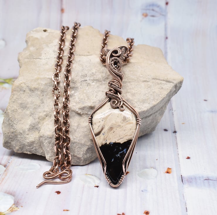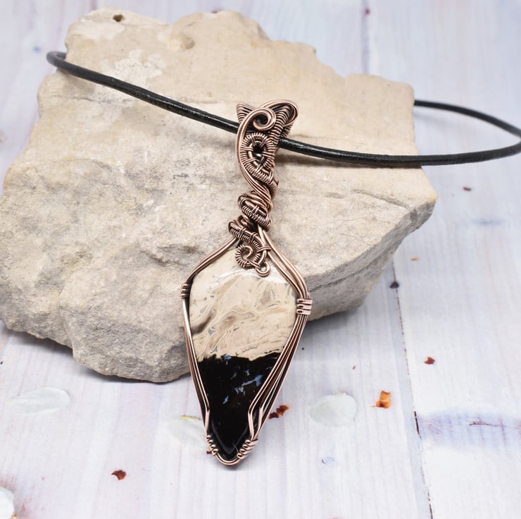 I have wire wrapped and woven around this striking stone using solid copper wire to create this gothic style pendant.