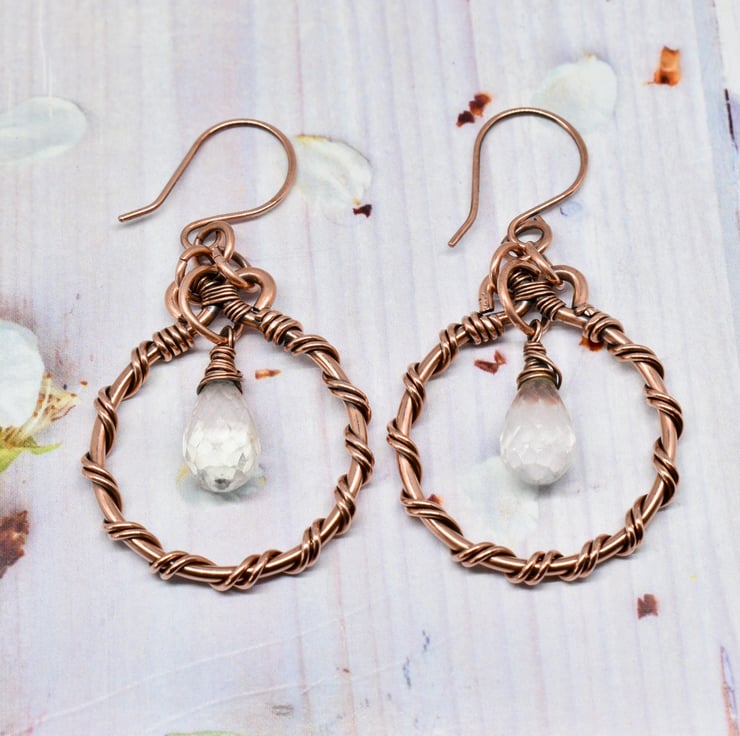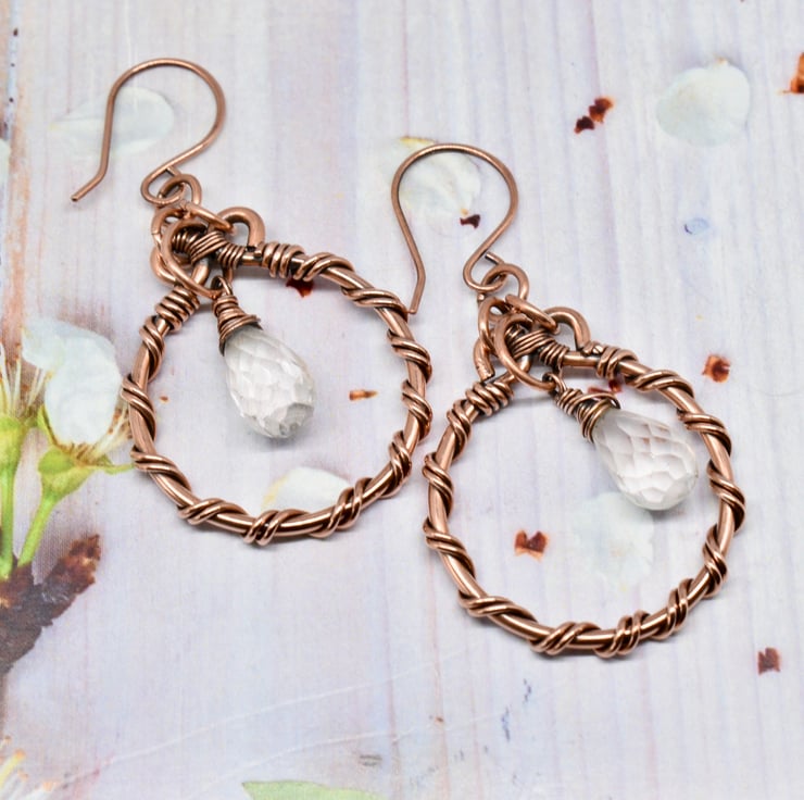 I used solid copper wire to form these lovely hoop earrings which have a beautiful faceted clear quartz stone in the centre.