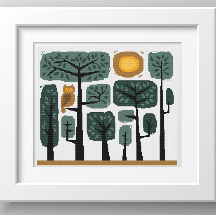 Cross Stitch Pattern Scandinavian Folk Art Owl in Enchanted Forest Trees - Mid-Century Modern instant PDF chart by Vivienne Powers - 006