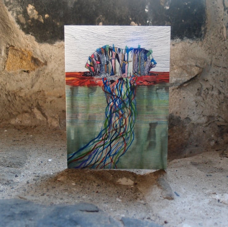 This card is 5"x7" in size. It comes wrapped in a compostable cello bag with an envelope made from recycled paper. 'Season's greetings' is printed on the inside of the card.