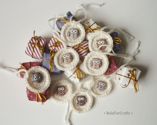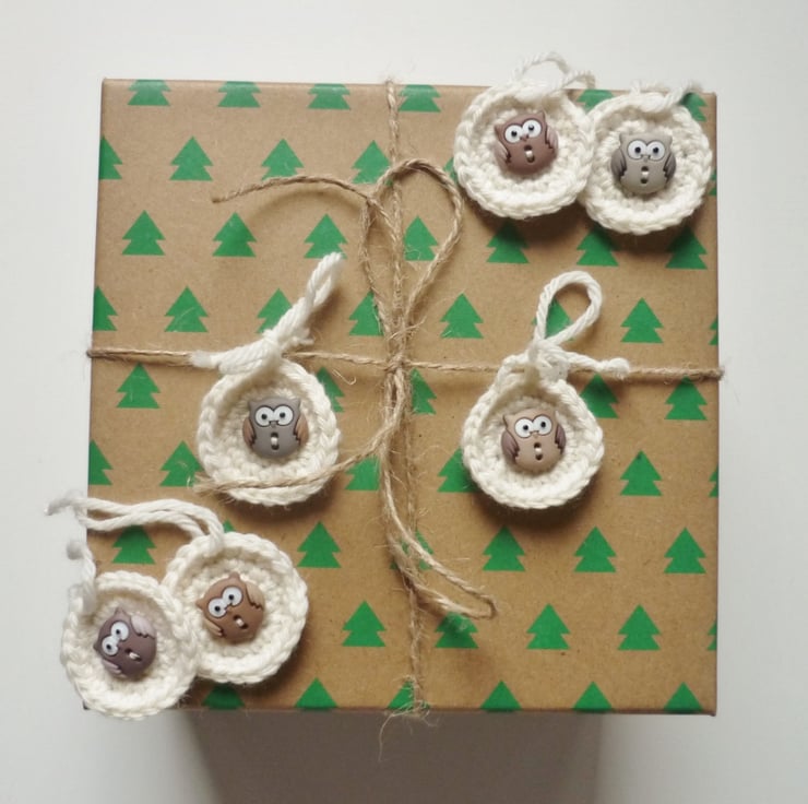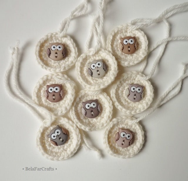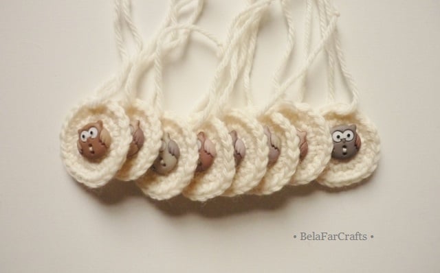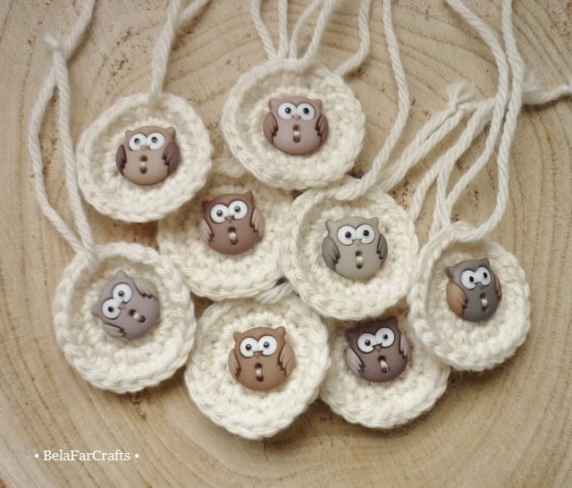 I hand crocheted the tags with wool blend yarn in cream and added owl ornamental buttons for more cuteness. They measure about 3.5cm (1.5in) in diametre and come with matching yarn attached.